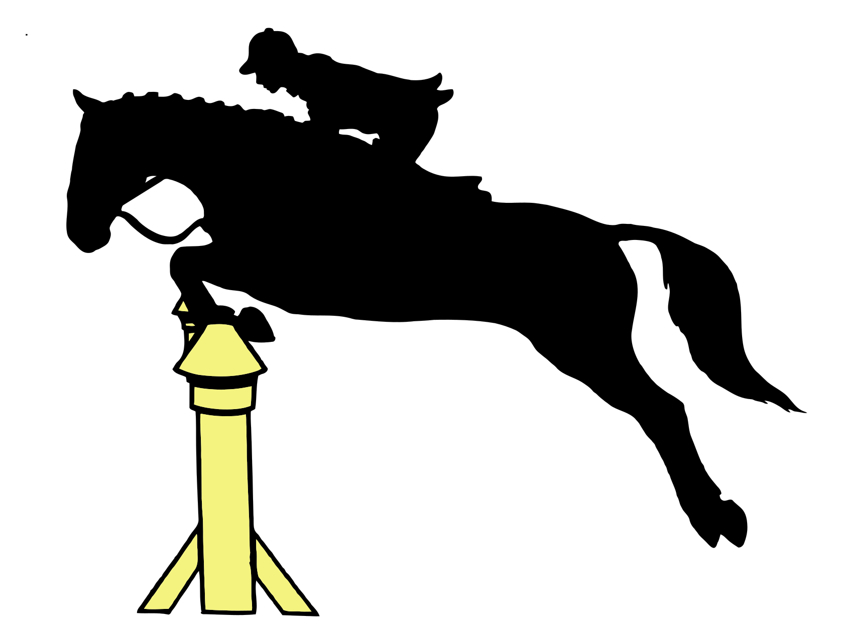This features a black and white silhouette of a horse with a jockey riding it. The horse is galloping, creating an impression of speed and motion. The jockey appears to be focused on the task at hand, guiding the horse through its movements. The scene captures the essence of equestrian sports and the bond between the rider and the horse.