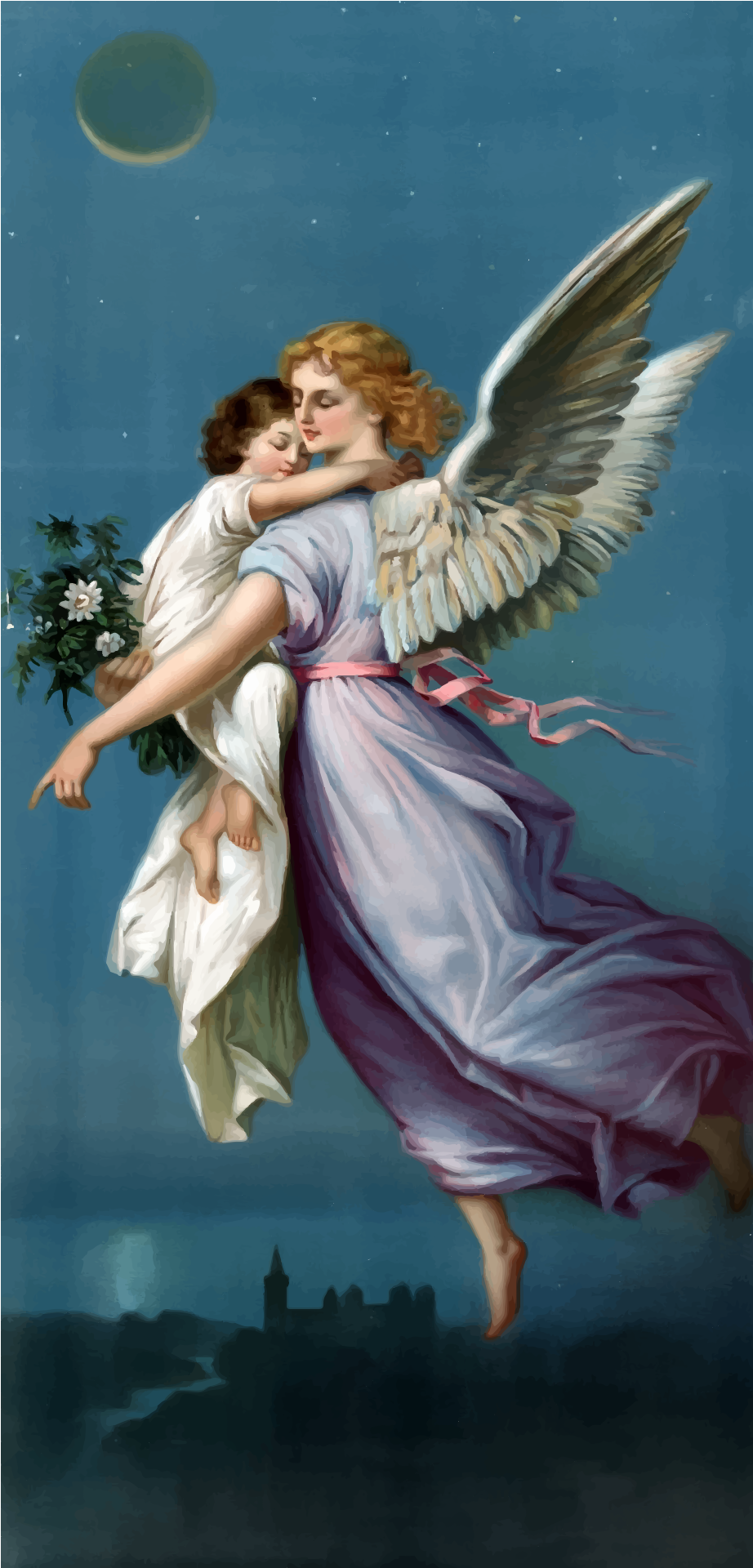 Tags: angel, child, female, girl, illustration, landscape, night, non-human beings, semi-realistic people, vintage, wing, baby, love, moon, pink, purple, white