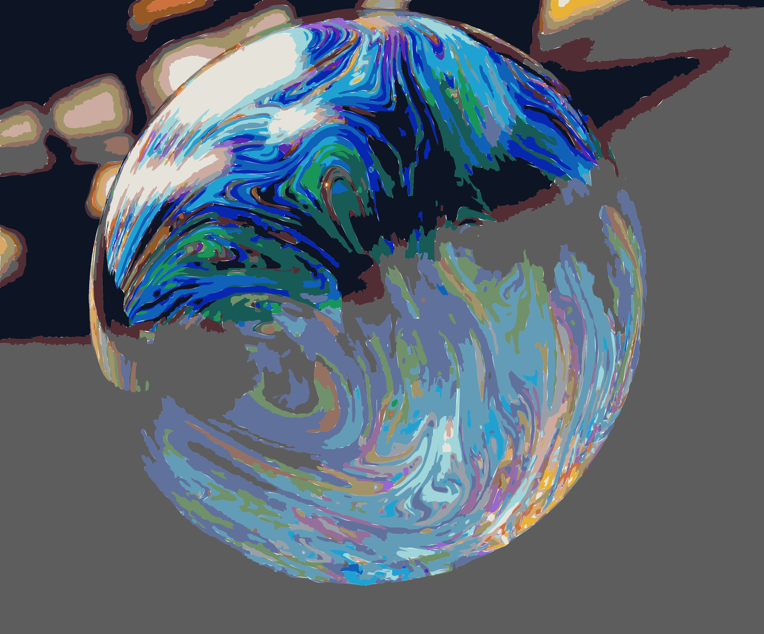 This features a large, colorful glass ball floating in the air. It appears to be a close-up of the bubble, showcasing its vibrant colors and intricate patterns. The glass ball is positioned towards the center of the frame, drawing attention to its unique design and captivating appearance. This artistic representation of a bubble creates an interesting visual effect that can evoke feelings of wonder and curiosity in viewers.