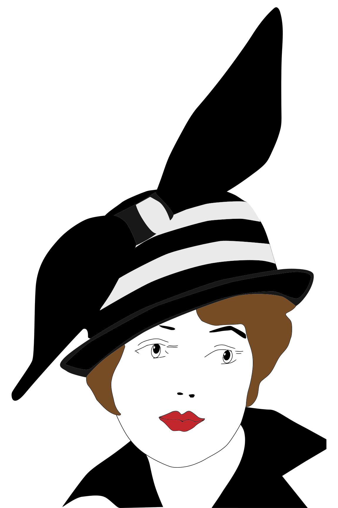 This features a woman wearing a black and white hat with a feather on top. She is looking directly at the camera, giving off an elegant and sophisticated vibe. Her eyes are open wide, drawing attention to her gaze. The woman's outfit appears to be from the 1920s era, adding a touch of nostalgia to the scene. Overall, the image captures a moment in time with an old-fashioned flair.