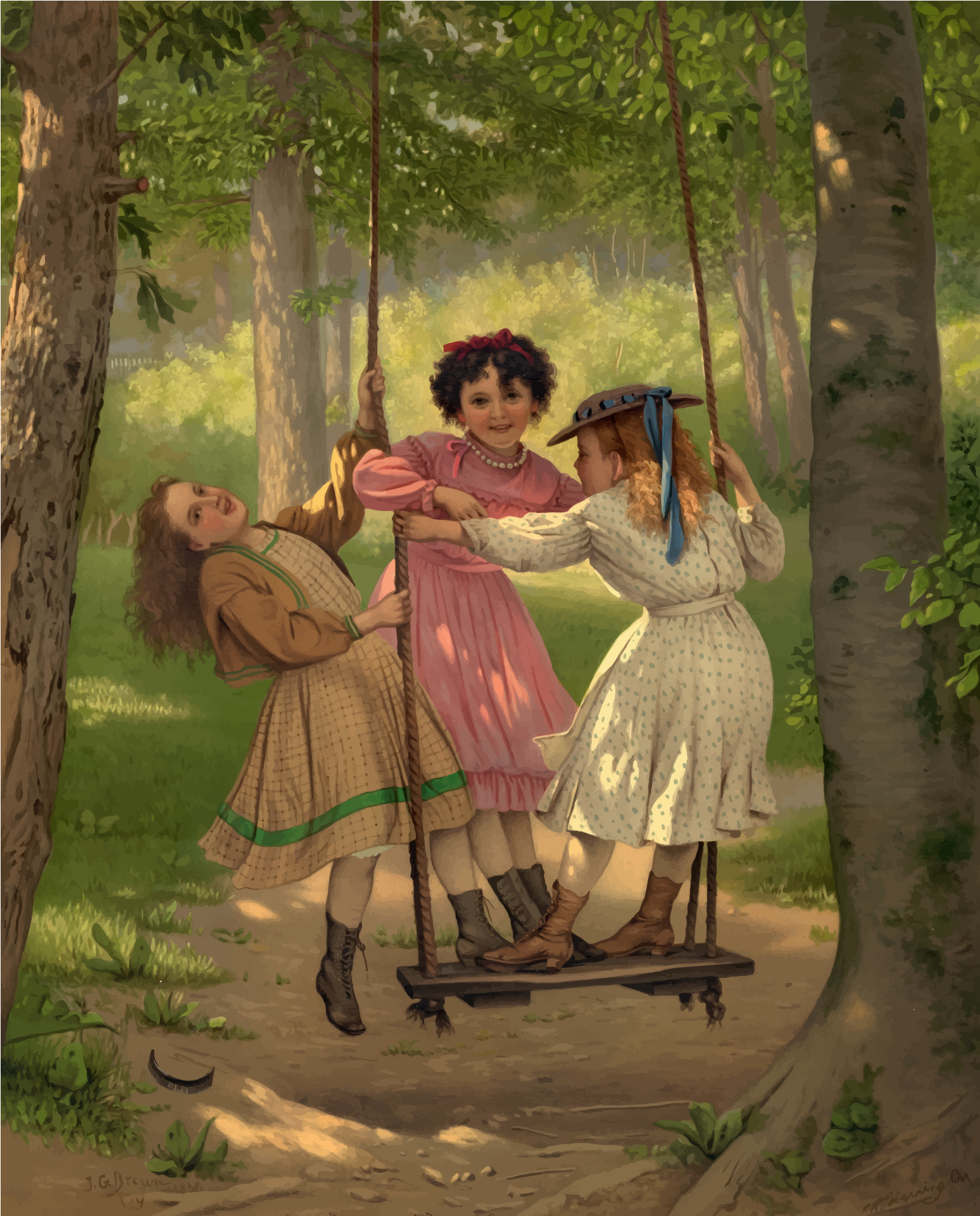 Tags: females, forest, girl, illustration, old, painting, playing, semi-realistic people, swing, three, vintage
