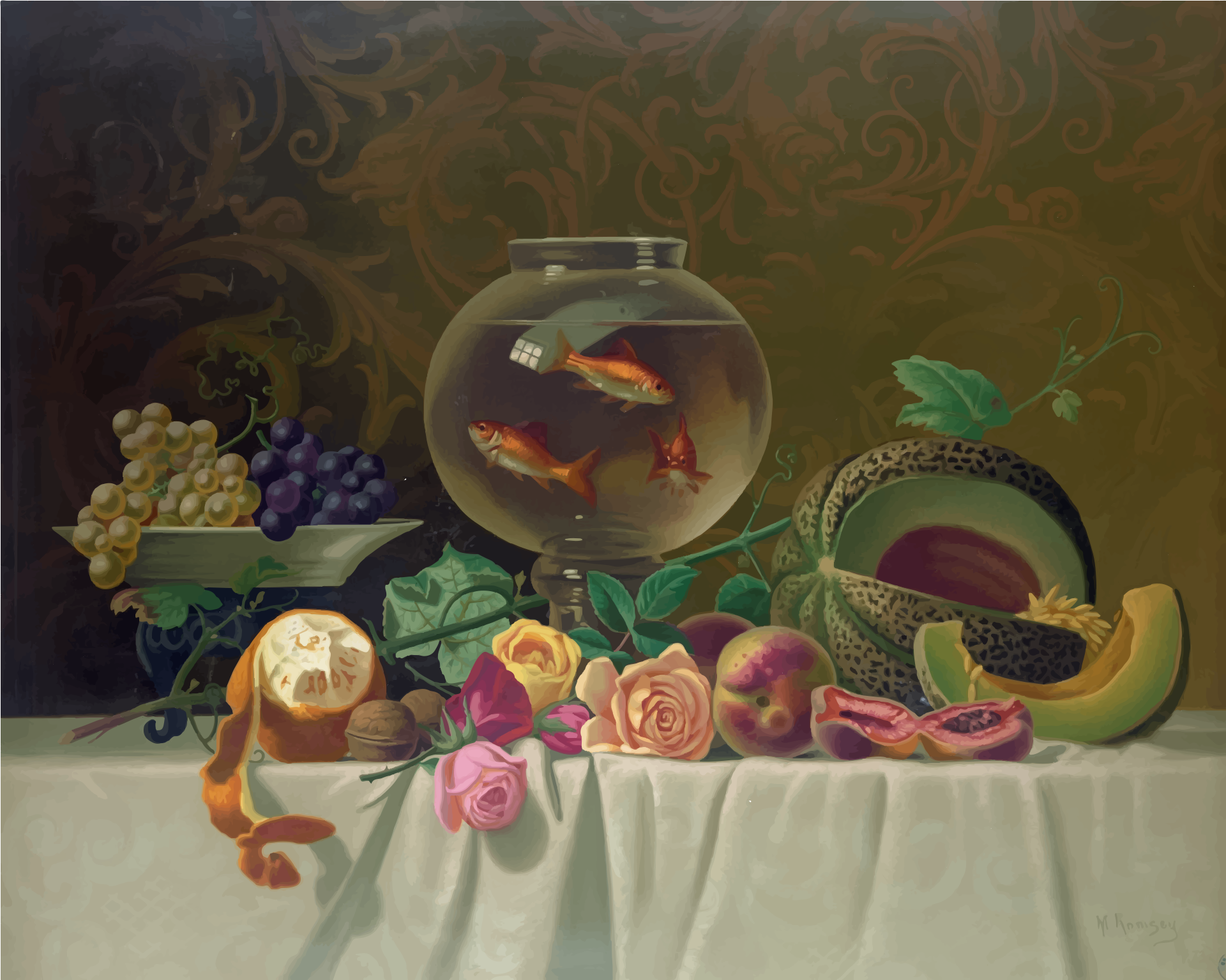 This is a painting of a table with various fruits and vegetables on it. There are several apples, oranges, grapes, and bananas arranged in different positions across the table. A bowl filled with fruit can be seen as well, adding to the variety of items displayed. Additionally, there is a fishbowl containing two fish swimming around, which adds an interesting element to the still life painting. The overall composition creates a visually appealing and colorful scene that showcases the artist's skill in capturing different elements within a single image.