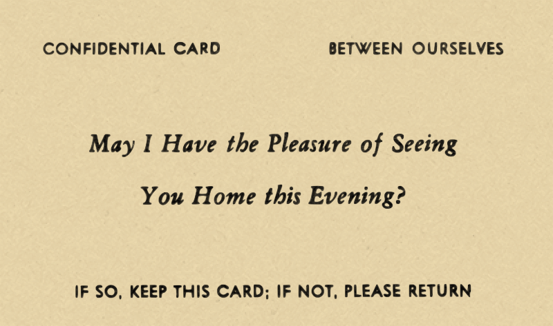 This features a card with a message written on it. The card is brown and has the words "Confidential Card" at the top, followed by the phrase "Between Ourselves." Below this, there are several lines of text that read, "May I have the pleasure of seeing you home this evening? Please keep this card; do not return it." The message is written in a cursive style and appears to be an invitation or request for someone.