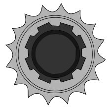 This features a close-up of a spiky wheel with a black circle in the center. This wheel is likely part of a gear, as it has an intricate design and is made up of multiple parts. The spikes on the outer edge add to its unique appearance, making it stand out from other wheels or gears. The combination of grey and black colors gives the wheel a striking contrast against any background, drawing attention to its details.