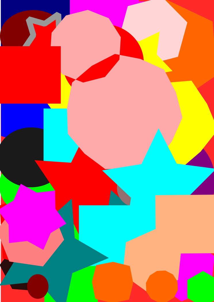 This is a colorful collage of various shapes and colors, including reds, pinks, yellows, oranges, greens, blues, and purples. There are several stars scattered throughout the collage, adding to its vibrant appearance. Some of these stars are located in the top right corner, while others can be found in the middle and bottom sections of the image. The overall effect is a visually engaging and lively composition that showcases an array of colors and patterns.