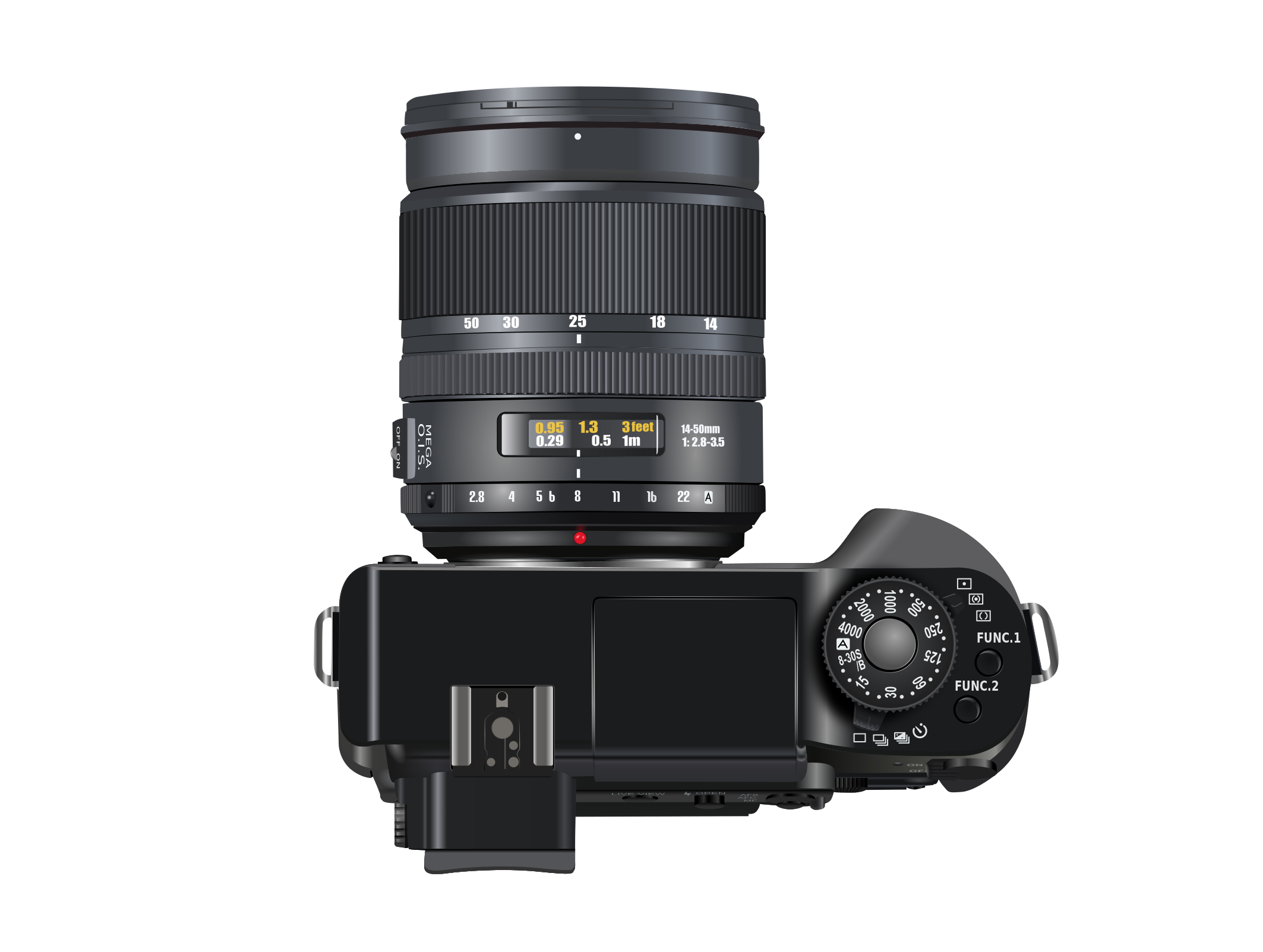 This features a professional camera with a large lens, sitting on top of a black surface. The camera is equipped with various buttons and controls for adjusting settings and capturing images. It appears to be an advanced model designed for high-quality photography. The lens is prominently displayed in the center of the image, drawing attention to its size and importance as part of the camera setup.