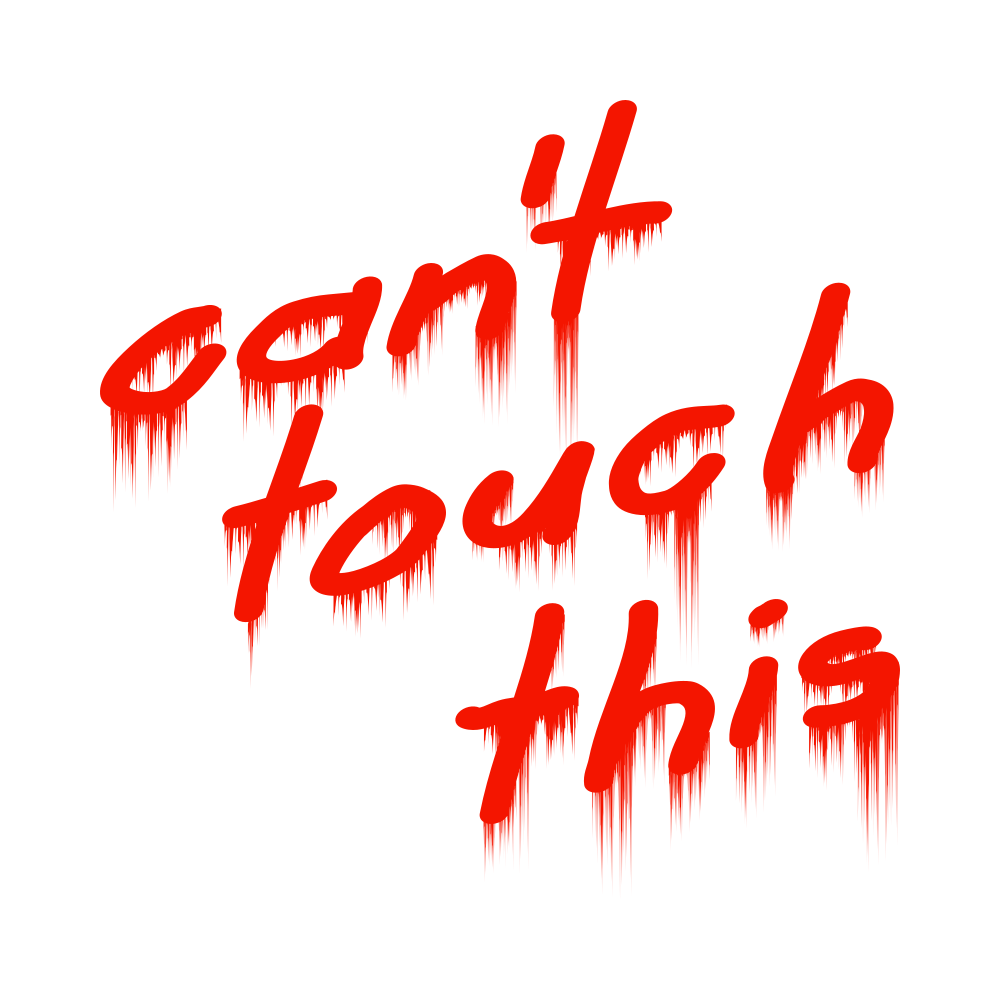 This features a white surface with red letters painted on it, creating the phrase "Can't touch this." The letters are not dry because there is paint dripping from them. This artistic display of text and paint creates an interesting visual effect that draws attention to the message conveyed by the words.