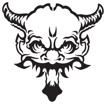 This features a demonic face with horns and an angry expression. It appears to be a black and white drawing, giving it a classic or vintage feel. The demon's eyes are wide open, and its mouth is slightly open, showing teeth. The design of the demon seems to be inspired by mythical creatures, such as goats or bulls, with horns adorning its head. Overall, the image exudes a sense of danger and fear, making it an intriguing piece of artwork.