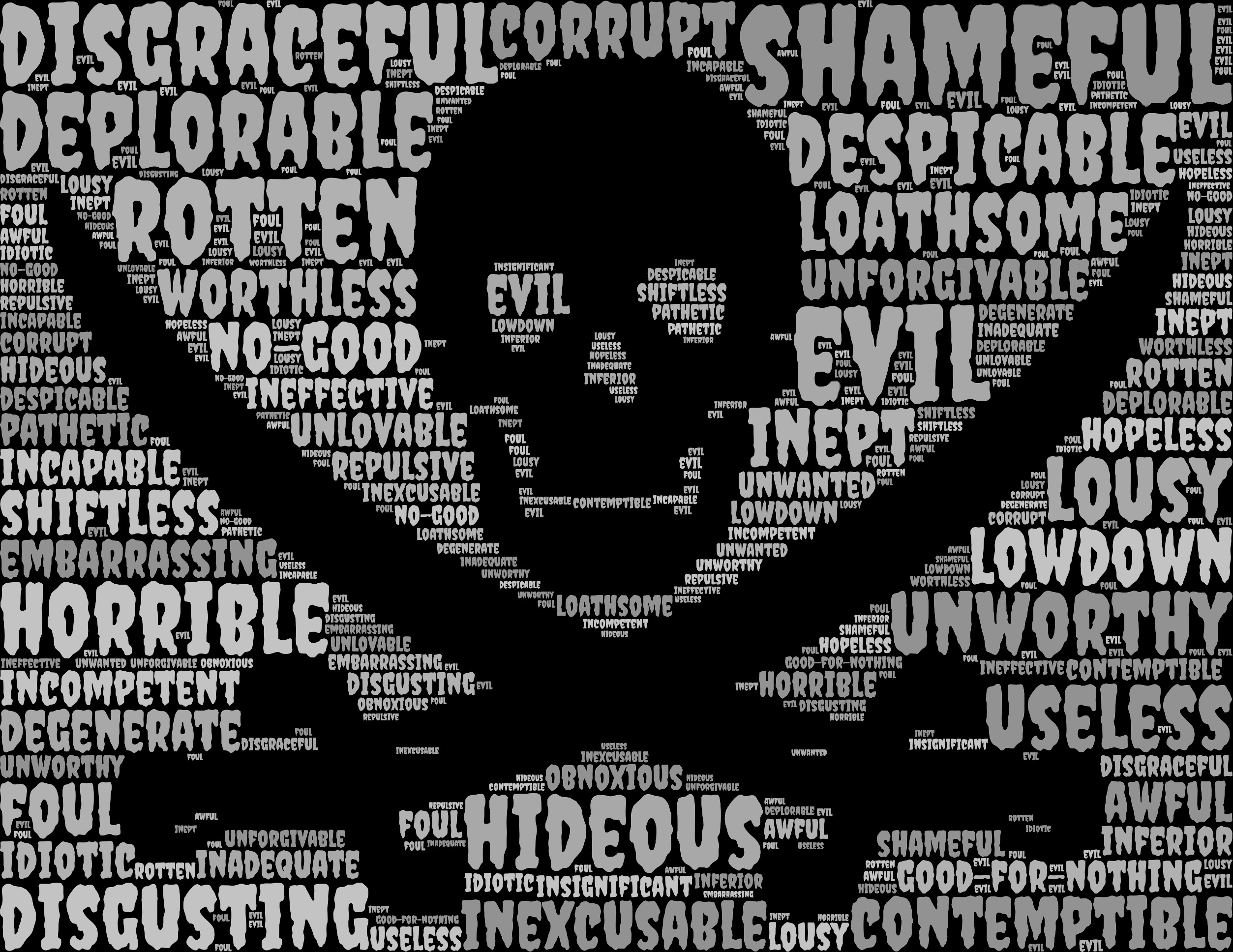 This features a skull and crossbones symbol, which is often associated with danger or death. This particular skull and bones design has been created using words that are related to negative emotions or experiences. The words used in the design include disgraceful, corrupt, shameful, dishonorable, unworthy, unprofitable, unpleasant, horrible, wicked, unjustifiable, and contemptible. These words are arranged around the skull and bones symbol to create a visually striking and thought-provoking image that conveys negative emotions or experiences.