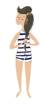 This features a woman in a bathing suit, standing on the beach. She is wearing a striped top and has long hair that she is squeezing out of her head. Her pose suggests that she may have just finished swimming or playing in the water. The scene captures a casual and relaxed atmosphere typically associated with beach activities.