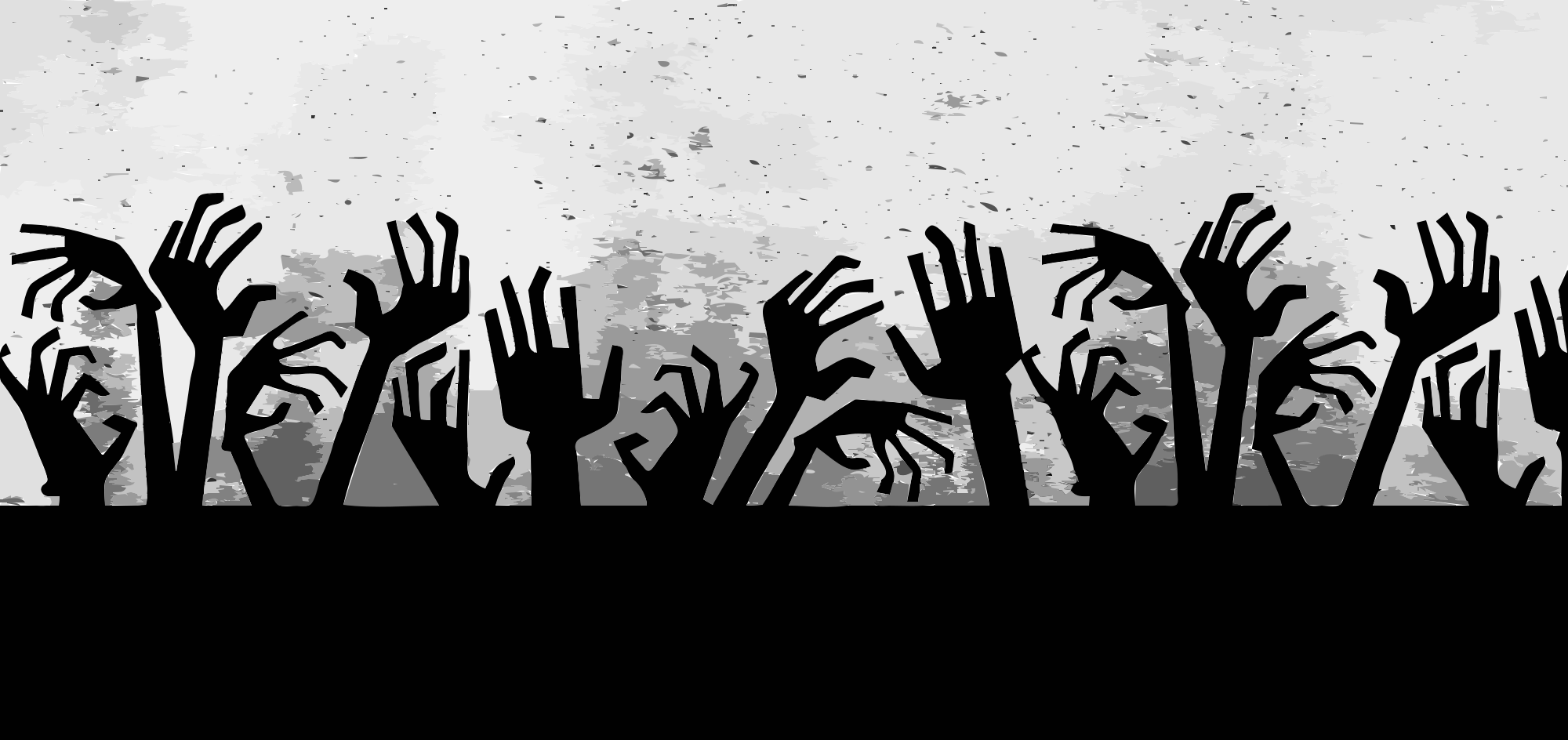 This features a black and white scene of several hands reaching up from the ground. These hands are positioned in various directions, creating an eerie atmosphere. Some of the hands appear to be closer to the foreground while others extend further into the background. The overall composition gives off a sense of unease or even fear, as if the hands were attempting to reach out and grab something or someone. This artistic representation could evoke feelings of vulnerability or discomfort in viewers who are familiar with horror movies or stories involving zombie-like creatures.
