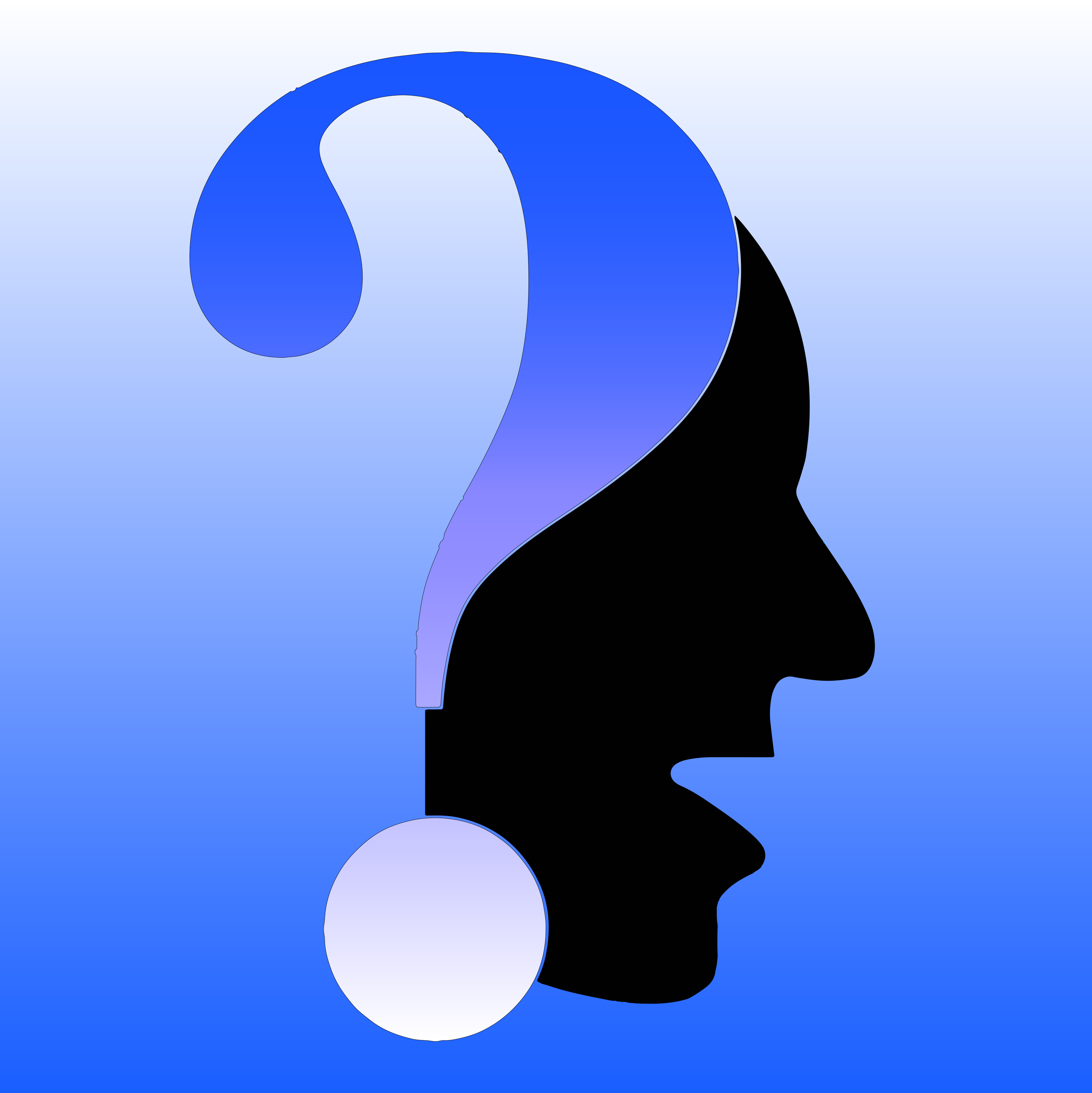 This features a blue and white question mark symbol, which is the central focus of the picture. The question mark has a black outline, giving it a bold appearance. Surrounding the question mark are two large, open mouths, one on each side, creating an interesting visual effect. These mouths appear to be talking or expressing something, adding a unique and engaging element to the overall composition of the image.