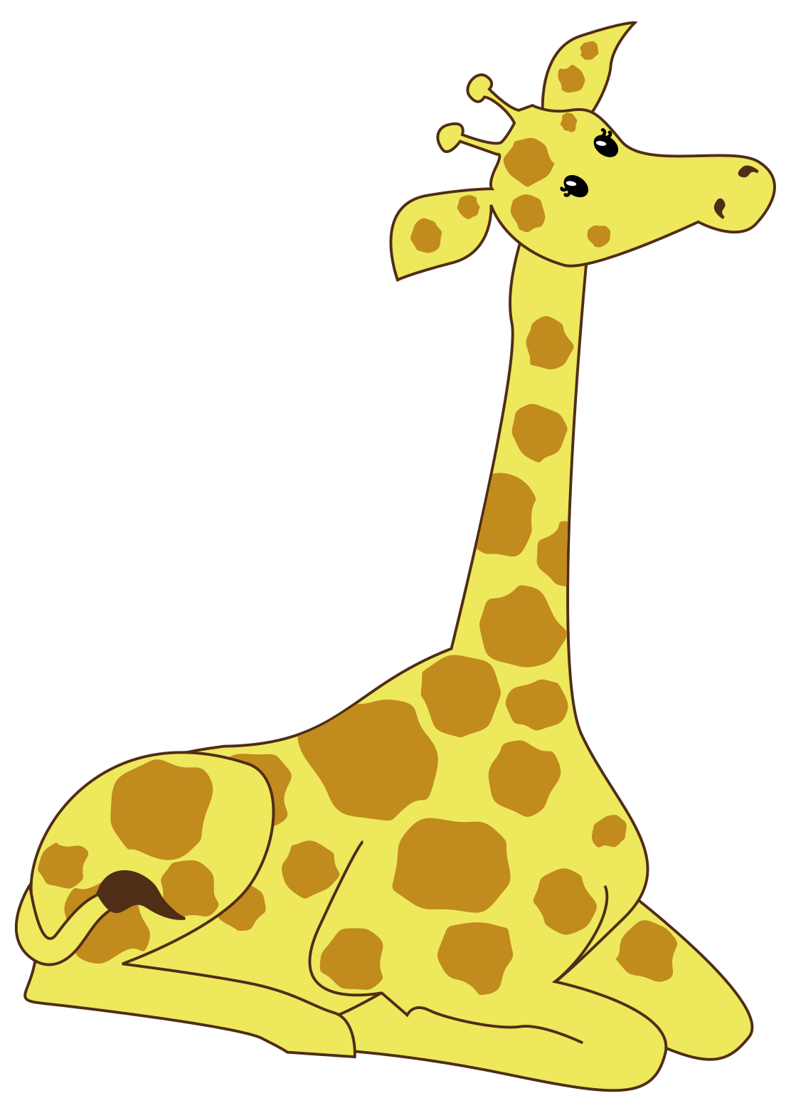 This features a cartoon giraffe sitting down on the ground. It is a yellow colored character with brown spots all over its body, giving it a unique and eye-catching appearance. The giraffe's long neck is prominently displayed as it sits in front of a plain background. This whimsical illustration captures the essence of a giraffe while adding a touch of creativity through its cartoon representation.