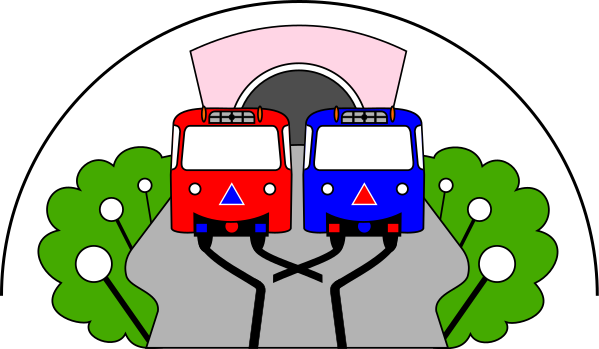 This features a creative illustration of two buses, one red and the other blue, standing next to each other on a road. They are positioned in such a way that they appear as if they are hugging or embracing each other. This unique artwork is set against a backdrop of trees, giving it an outdoor feel. The buses are placed at different angles and heights, adding depth to the scene. Overall, this illustration showcases a playful and imaginative interpretation of two buses on a road.