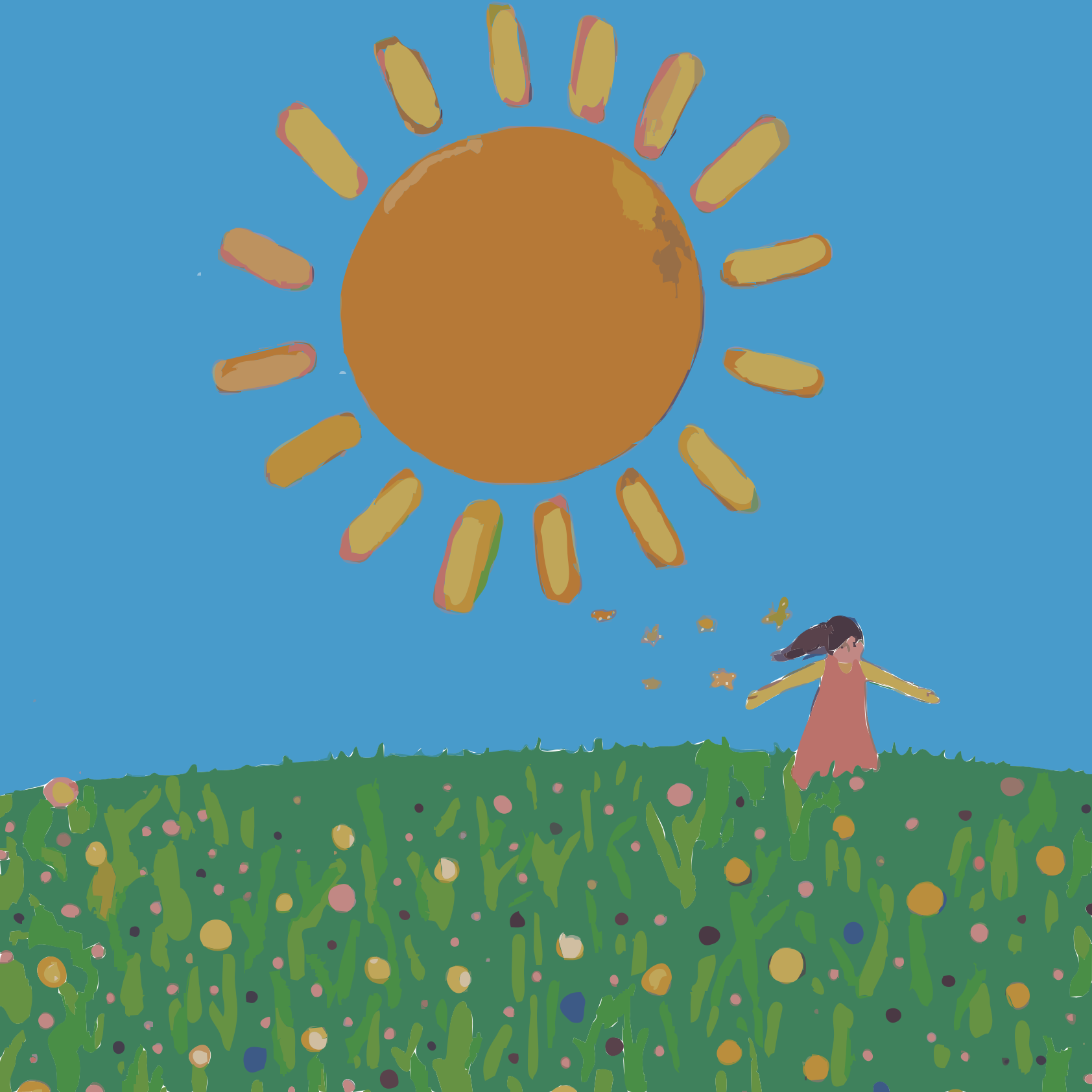 This features a woman standing in a field of flowers, with the sun shining brightly above her. The sun is depicted as a large yellow circle, casting its warm rays over the scene. The woman appears to be enjoying her time outdoors, surrounded by the vibrant colors and natural beauty of the flower field.