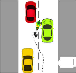 This depicts a busy street scene with multiple cars and a motorcycle. A person is riding the motorcycle, wearing a green shirt, and appears to be navigating through traffic. There are several other vehicles on the road, including two red cars and one yellow car. One of the red cars is positioned in front of the motorcycle, while another red car is located behind it. The scene also includes a person walking near the street, possibly crossing or waiting for someone. Overall, this image captures the hustle and bustle of city life with various modes of transportation sharing the road.