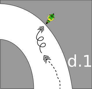 This features a cartoon character riding a skateboard on the side of a curved road. The skateboarder is positioned at the top of the curve, and there are several arrows pointing in different directions around them. These arrows likely indicate the direction to take while navigating the curve. The scene appears to be part of an animated cartoon or illustration, with the skateboarder being a prominent figure within it.