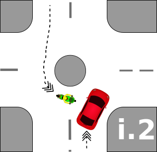 This depicts a scene of an accident on the road, with a red car and a man riding a bike about to collide. The man is positioned in front of the car, while the vehicle is approaching him from behind. There are several arrows pointing towards the direction of the collision, indicating that it's a potentially dangerous situation. Additionally, there is a traffic light visible on the left side of the scene, which might have been involved in the accident or could be related to the road conditions at the time.