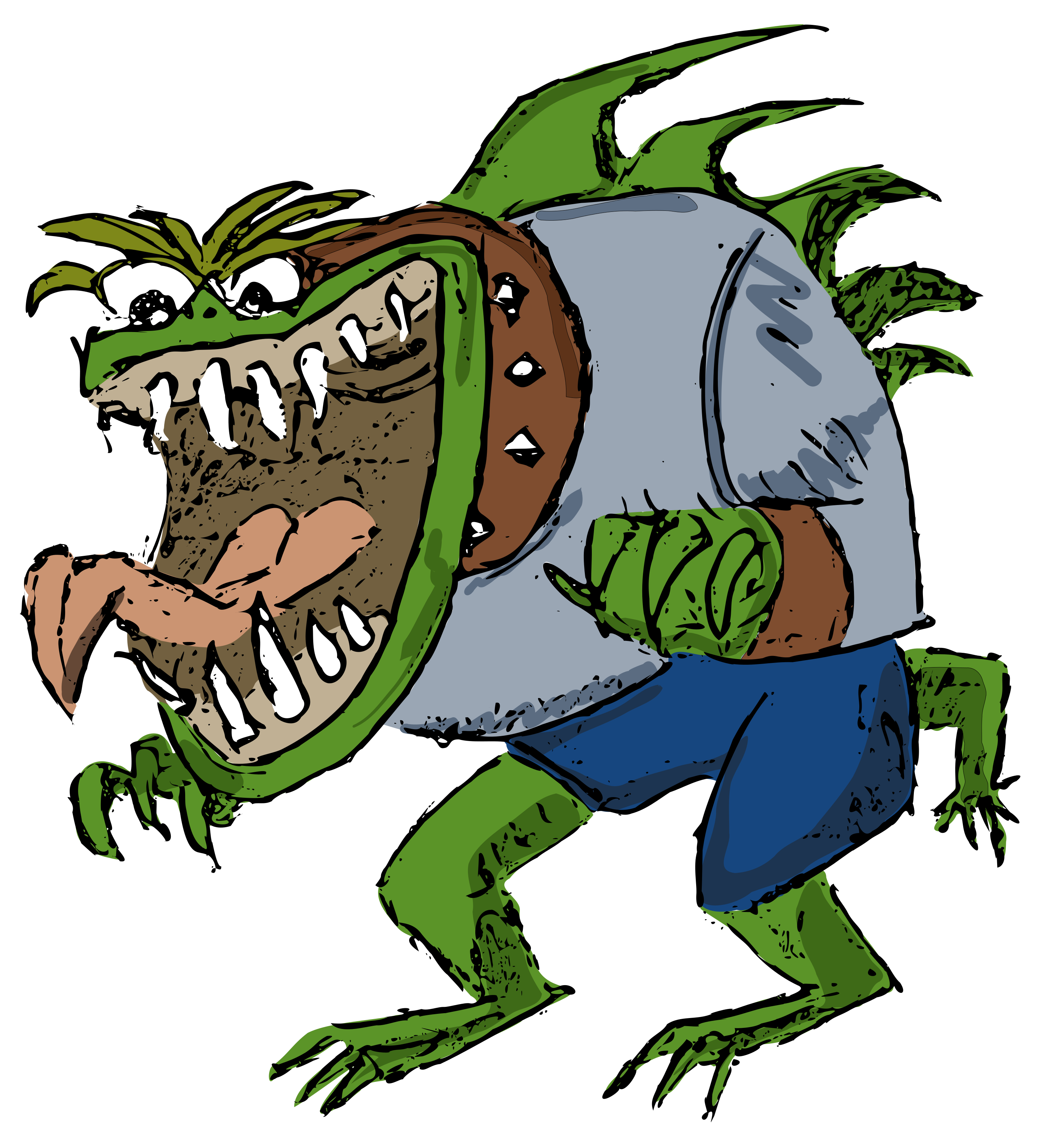 This features a green monster with an open mouth, showing its sharp teeth and tongue. It is wearing a grey shirt and blue shorts, giving it a casual appearance. The monster has sharp scales on its back, adding to its menacing presence. Its facial expression appears to be angry or aggressive, making the scene quite intense.