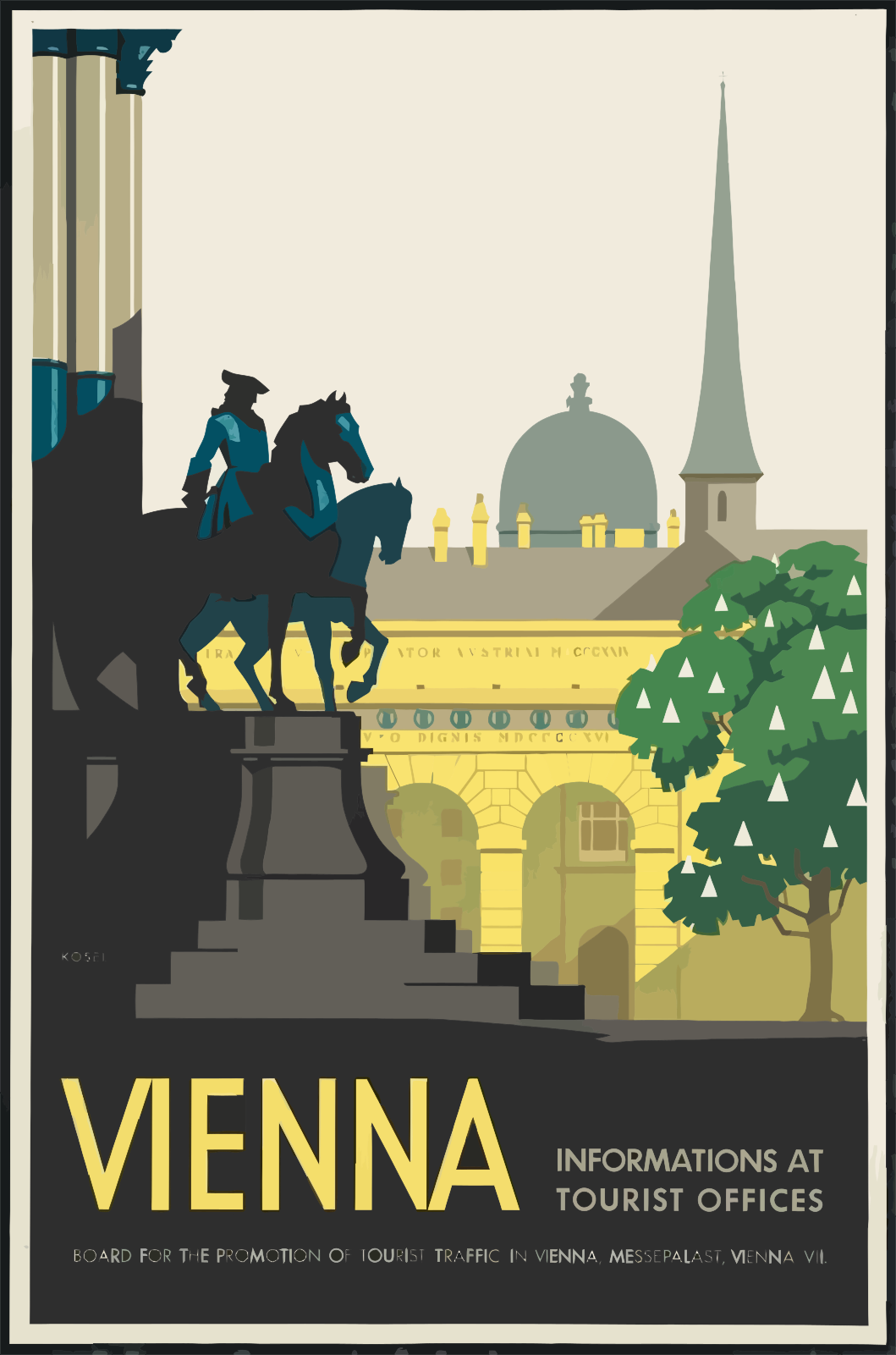 The poster is a black and white illustration of Vienna, Austria. It features a man riding a horse in front of an ornate building with a dome on top. There are several other buildings visible in the background, including one that resembles a castle. A tree can be seen near the center of the image, adding to the overall charm and beauty of the scene. The poster is likely promoting tourism or travel to Vienna, as it showcases the city's architectural wonders and historical significance.