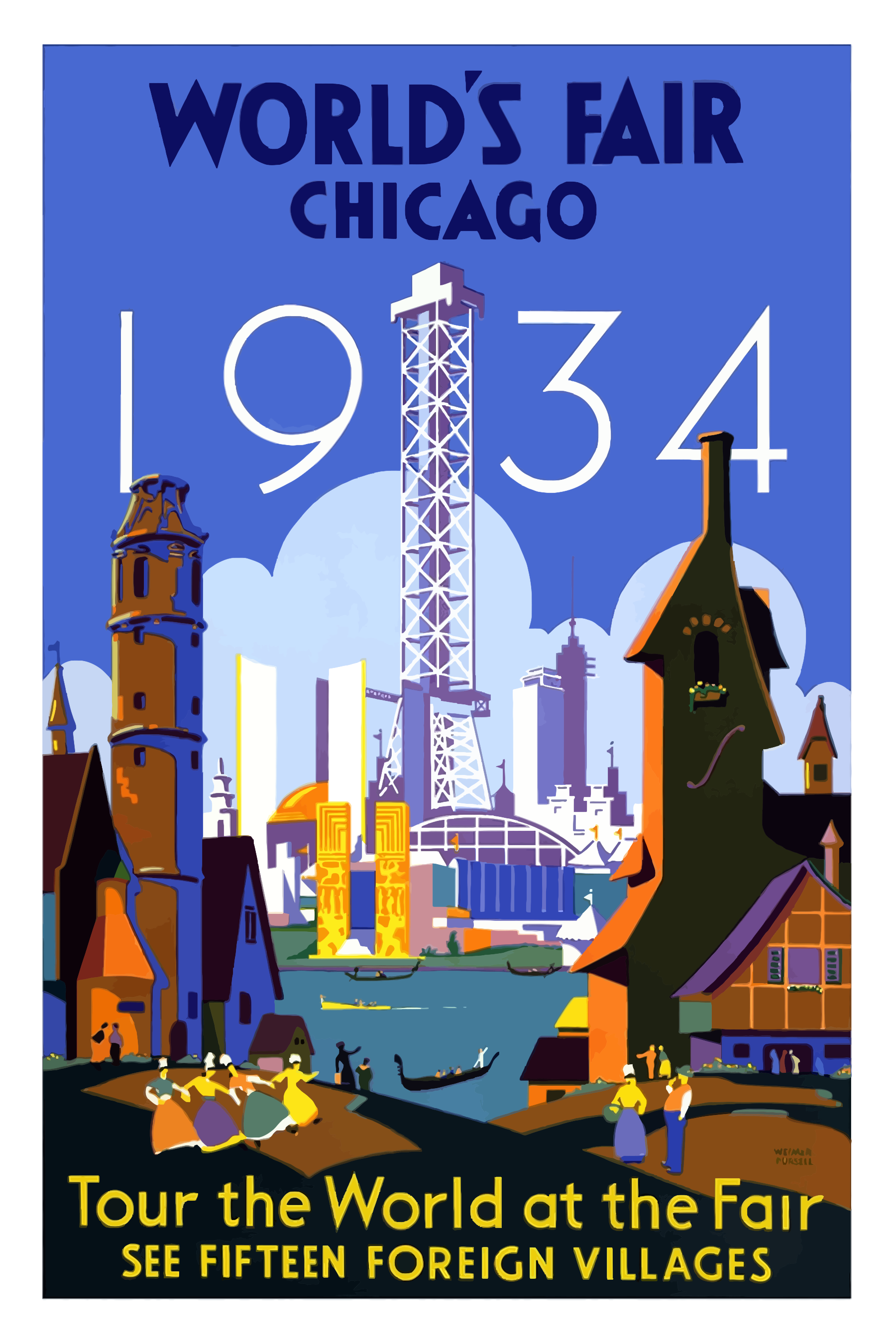This is a colorful poster advertising the Chicago World Fair in 1934. In the background, there are tall buildings and skyscrapers that represent the city of Chicago. The poster features an old-fashioned design with a vintage feel to it. At the bottom of the picture, there is text that reads "tour the world at the fair see fifteen foreign villages." This suggests that the World Fair was a place where people could explore and learn about different cultures from around the globe. The poster likely served as an advertisement for the event or a souvenir from the time of the fair.