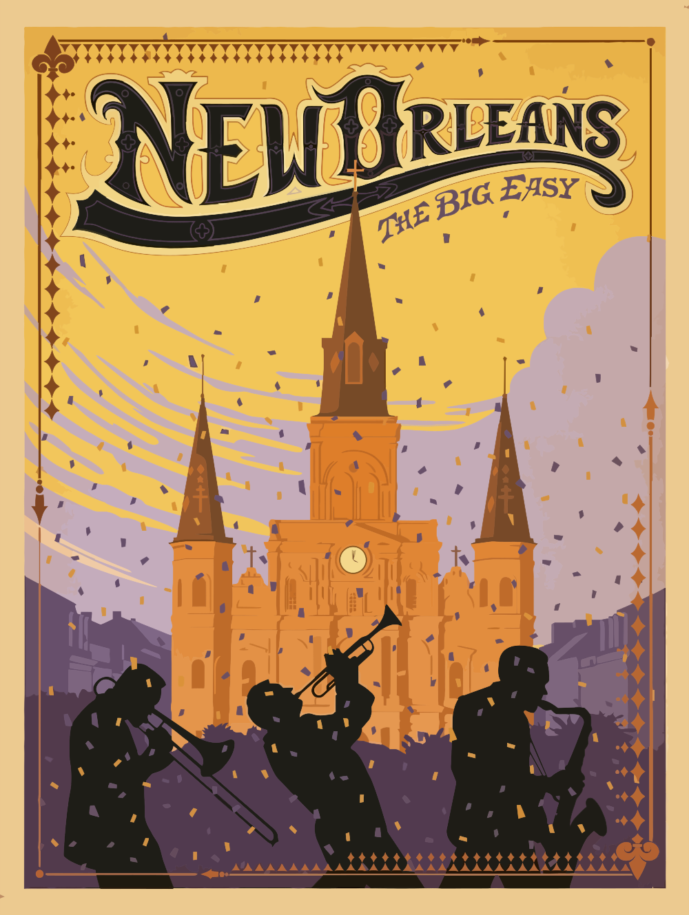 This is a colorful and vintage travel poster featuring three musicians playing instruments in front of the iconic New Orleans landmark, St. Louis Cathedral. The musicians are positioned on the left side of the poster, with one holding a trombone, another a trumpet, and the third an accordion. The background showcases the beautiful architecture of the cathedral, which is situated in front of a clock tower. In addition to the main landmark, there are two smaller clocks visible on the right side of the poster. The overall composition creates a lively atmosphere that highlights the charm and musical heritage of New Orleans.