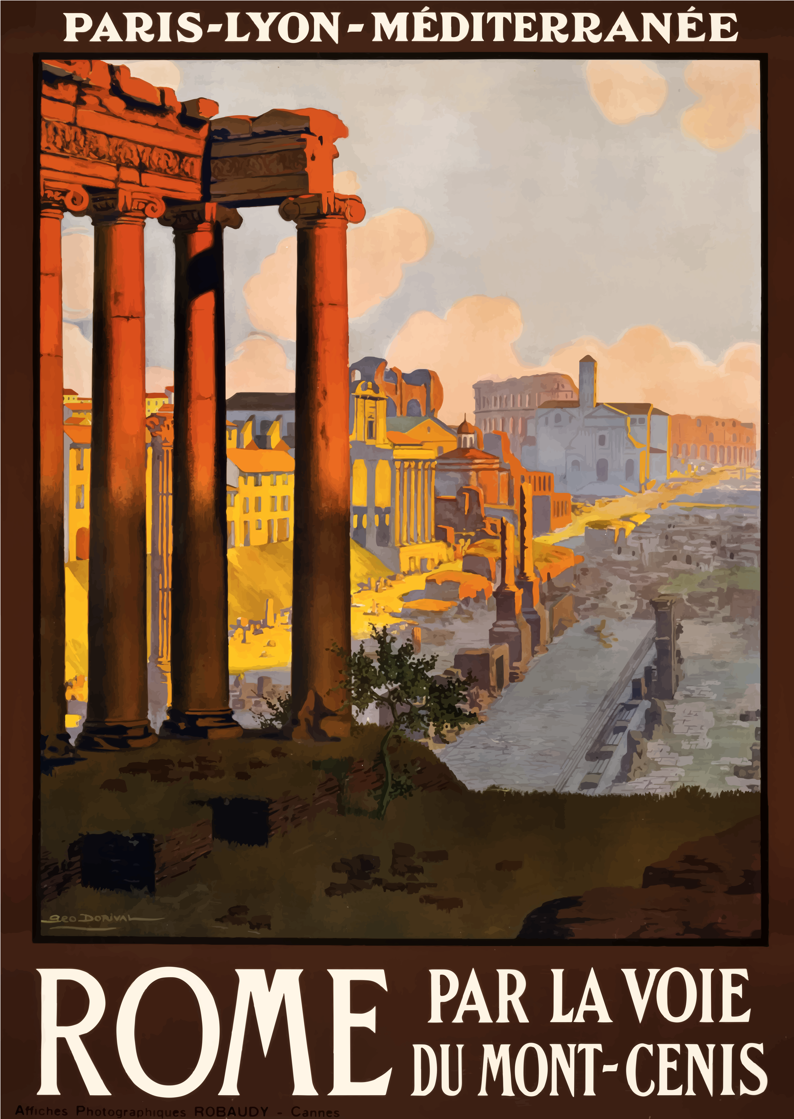 This is a colorful poster featuring the city of Rome, Italy. It showcases several pillars and buildings in the background, giving it an artistic and vintage appearance. The poster has a rectangular shape, making it suitable for framing or display purposes. The combination of the pillars, buildings, and the overall design creates a visually appealing representation of this iconic city.