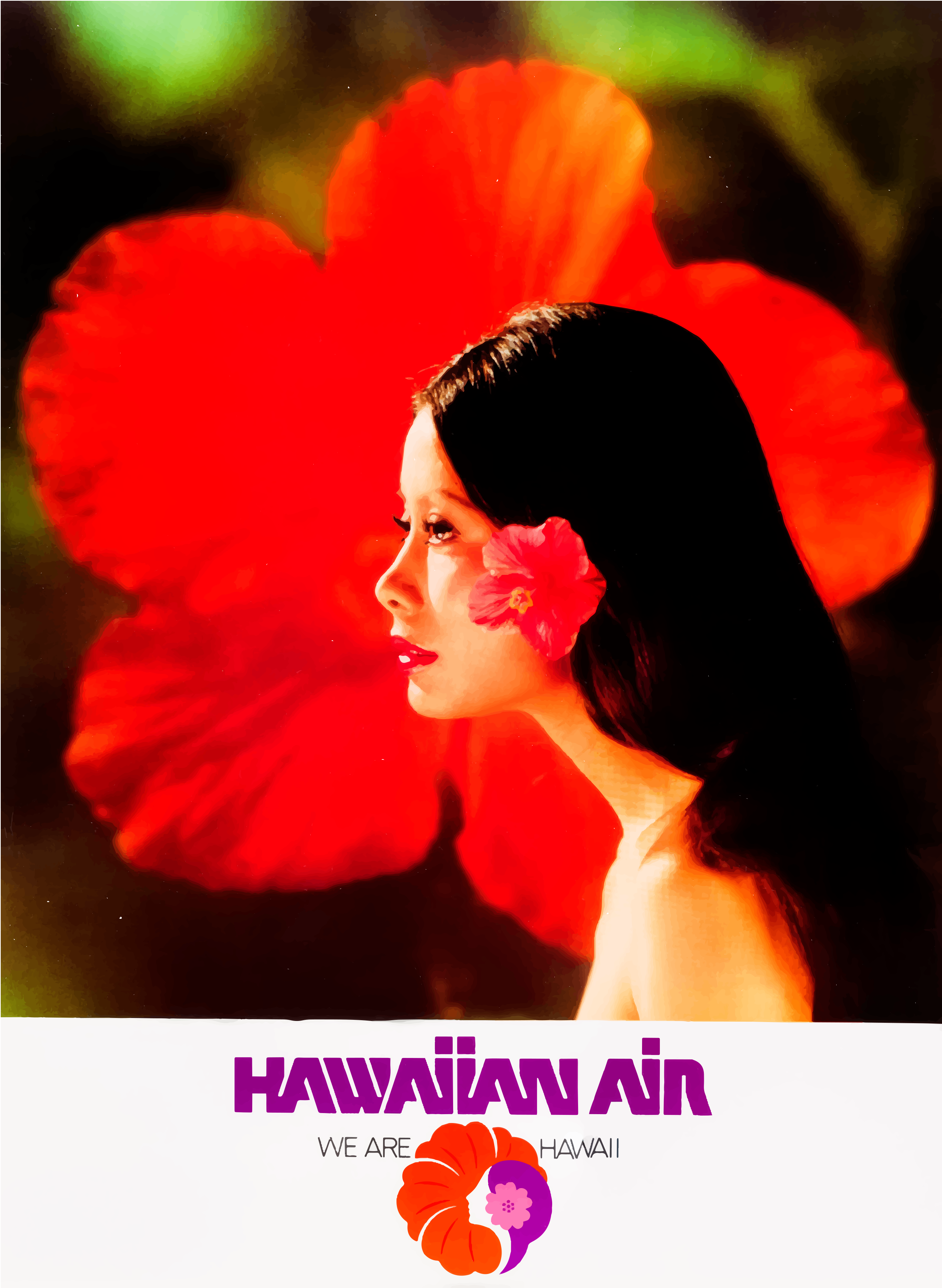 This features a woman with long hair and red flowers in her hair. She is wearing a necklace, which adds to the overall elegance of the scene. The woman appears to be posing for the camera, possibly for a Hawaiian Air advertisement. The background consists of a vibrant red flower, adding a pop of color to the image.