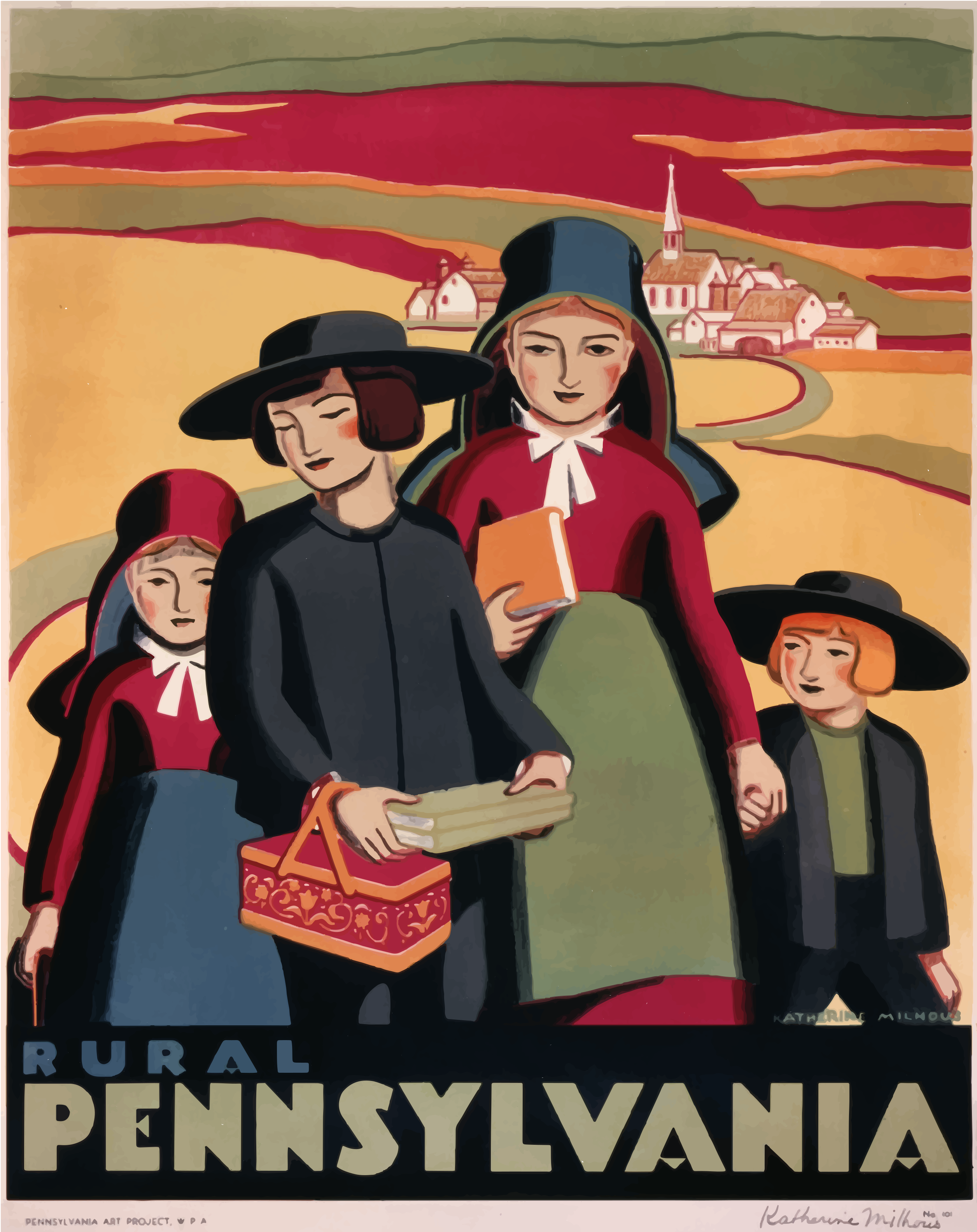 This is a colorful painting of a family in Pennsylvania, with the mother and her children standing together. They are dressed in old-fashioned clothing, which adds to the historical feel of the scene. In total, there are five people visible in the painting, including the mother and four children. The painting also features several books scattered throughout the image, possibly representing a love for reading or learning among the family members. The presence of these books suggests that they might have been involved in education or intellectual pursuits during their time in Pennsylvania. Overall, the painting captures a moment from the past and showcases the importance of family bonds and shared experiences.