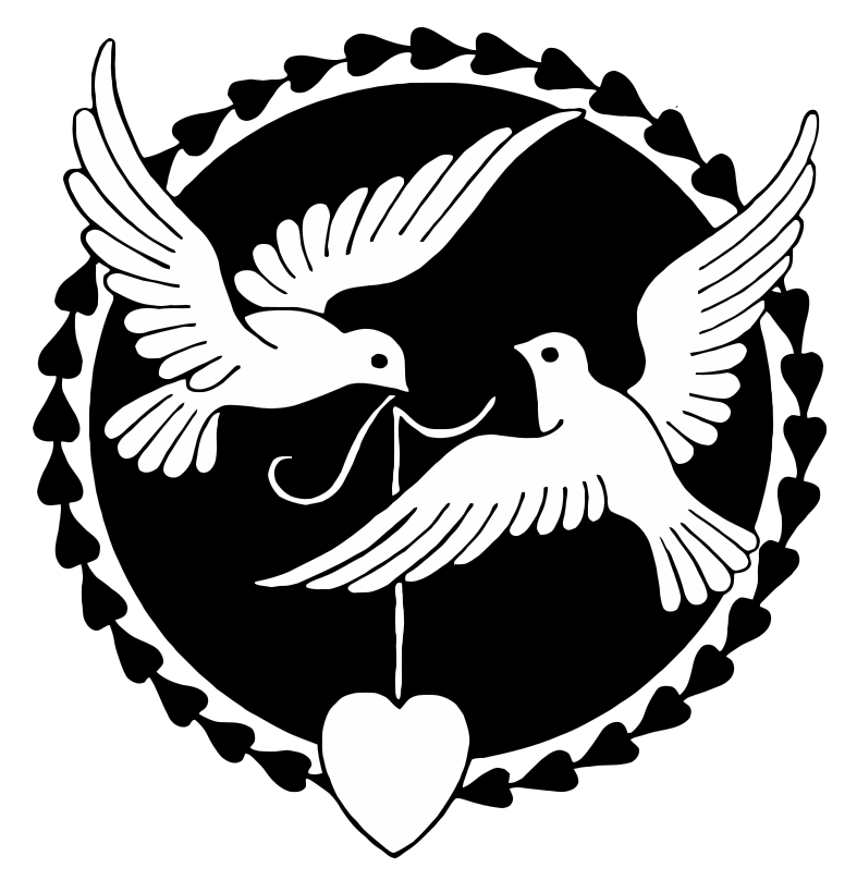 This features a black and white dove with a heart in its beak, flying next to another dove. They are both perched on a string that is hanging from the top of the circle. This artistic design showcases the beauty of these birds as they interact with each other. The overall composition creates an elegant and visually appealing scene.