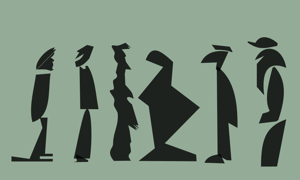 This features a group of six silhouettes, each depicting a person in various poses. They are all standing next to one another and appear to be part of an artistic display or possibly a treasure hunt. Each figure is distinctly different from the others, showcasing unique postures and expressions. The overall scene has a black and white color scheme, with the silhouettes being the main focus of the image.