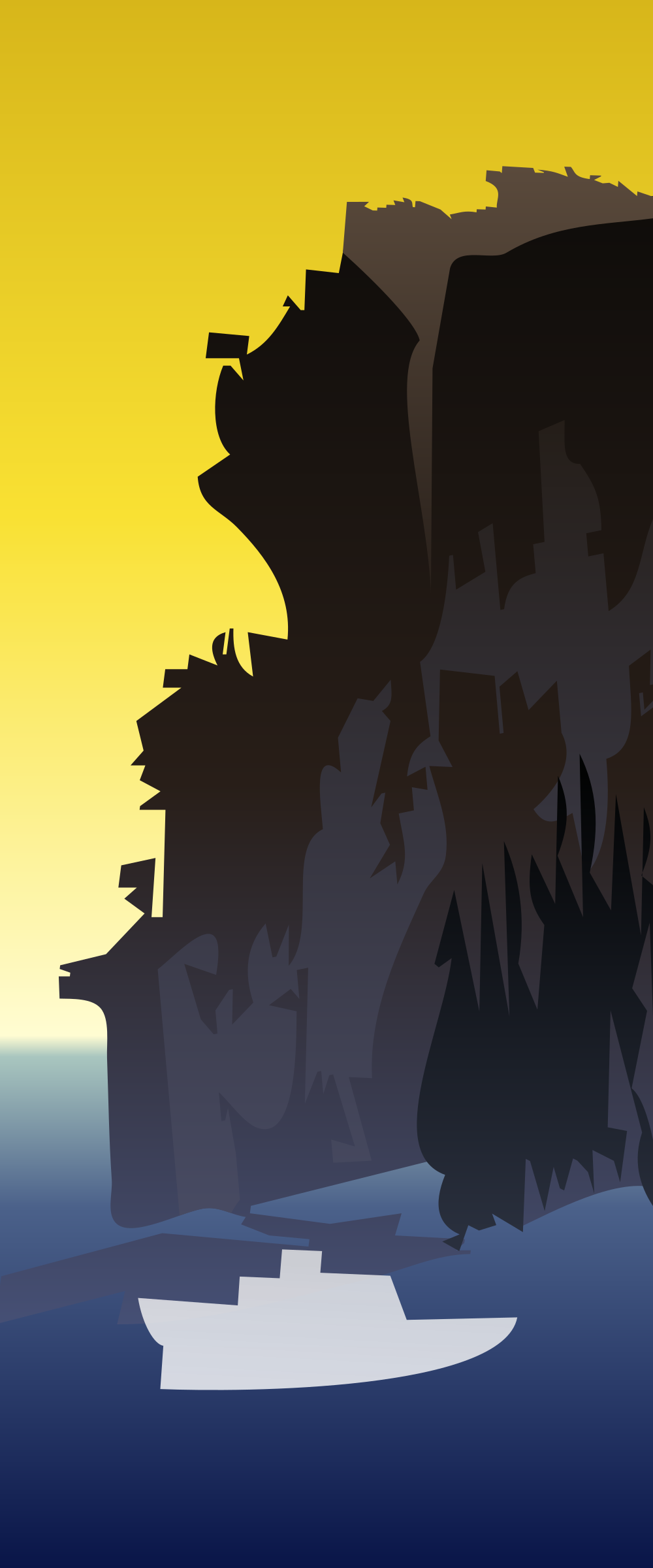 This features a boat floating on the water, with a mountainous landscape in the background. The boat is positioned towards the left side of the scene and appears to be relatively small compared to the surrounding environment. The mountains are dark and foreboding, creating an atmosphere of adventure or exploration. The combination of the boat and the majestic mountains creates a sense of depth and scale within the image.