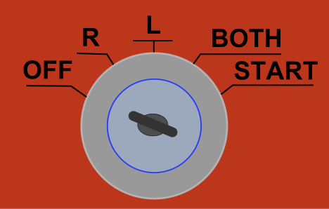 This features a close-up of an ignition switch for an airplane. This type of switch is used to control the ignition system, which powers the internal combustion engine. The switch has two settings: both off and both on. When set to both off, the magnetos are not providing spark to the engine, while when set to both on, the magnetos are powered and ready for use. This design ensures that the aircraft can safely operate without any issues related to the ignition system. The switch is located in a red background, which contrasts with the black text describing its function.