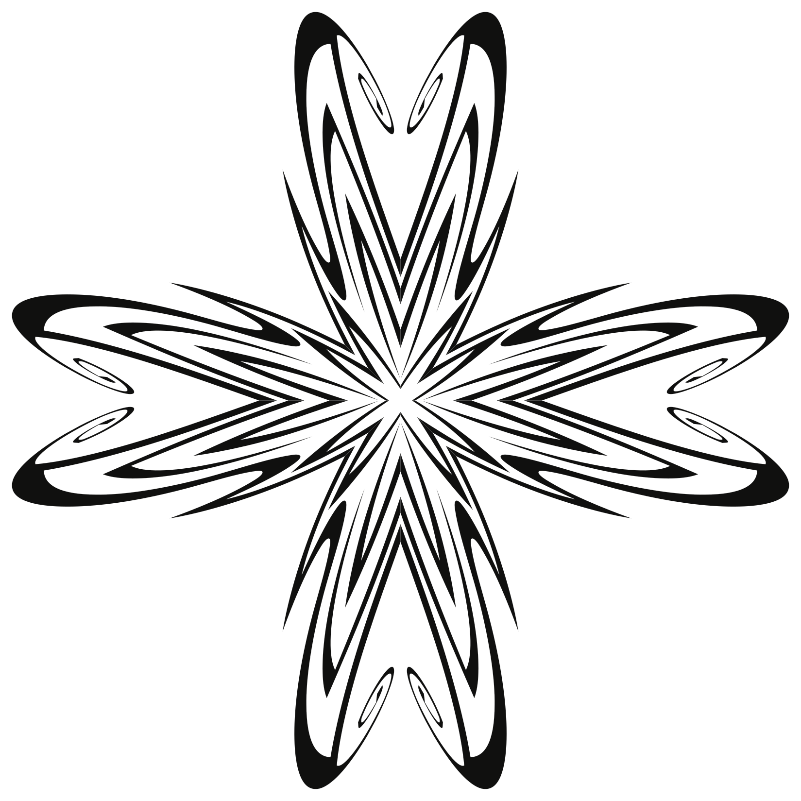 This features a black and white design of an abstract flower. The flower is composed of multiple petals, each with varying shapes and sizes. Some of the petals are larger and more prominent, while others are smaller and less noticeable. The overall effect creates a visually striking pattern that resembles a flower. The contrast between the black and white colors adds depth to the design, making it an interesting piece of artwork.
