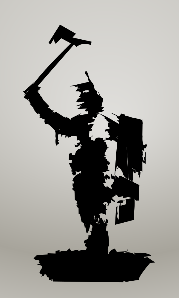 This features a statue of a warrior holding an axe and shield. The warrior appears to be standing on a pedestal, possibly in a museum or public space. The statue is black and white, giving it a classic appearance. The warrior's stance suggests that he is prepared for battle, but the combination of an axe and shield may not be the most practical choice for combat. This artistic representation captures the essence of a historical figure and serves as a reminder of the past.