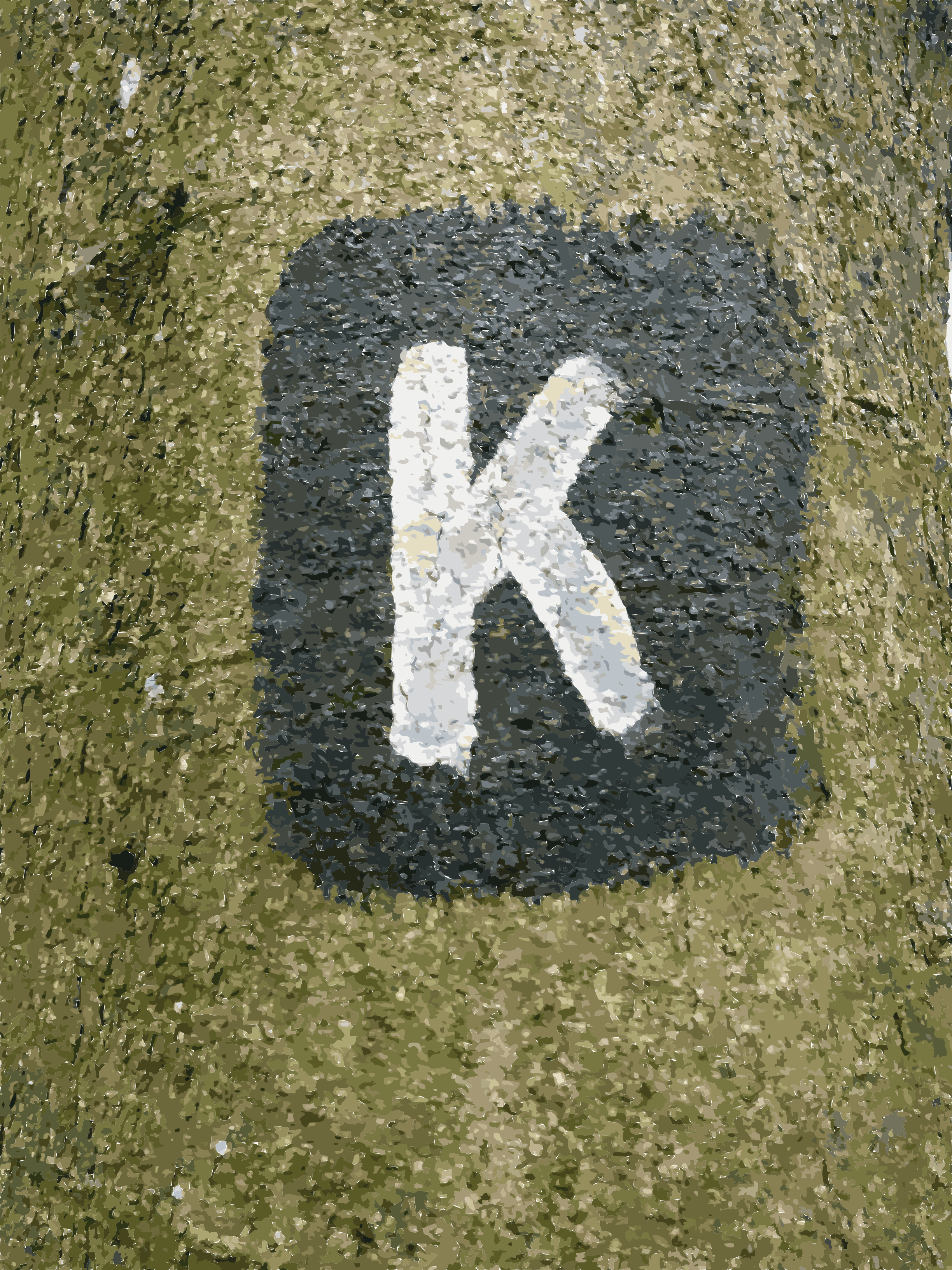 This features a tree with a black and white sign attached to it. The sign has the letter K written on it, possibly indicating a specific location or direction. The tree itself is covered in moss, giving it an old and weathered appearance. The combination of the tree, the sign, and the moss creates a unique and interesting visual scene.