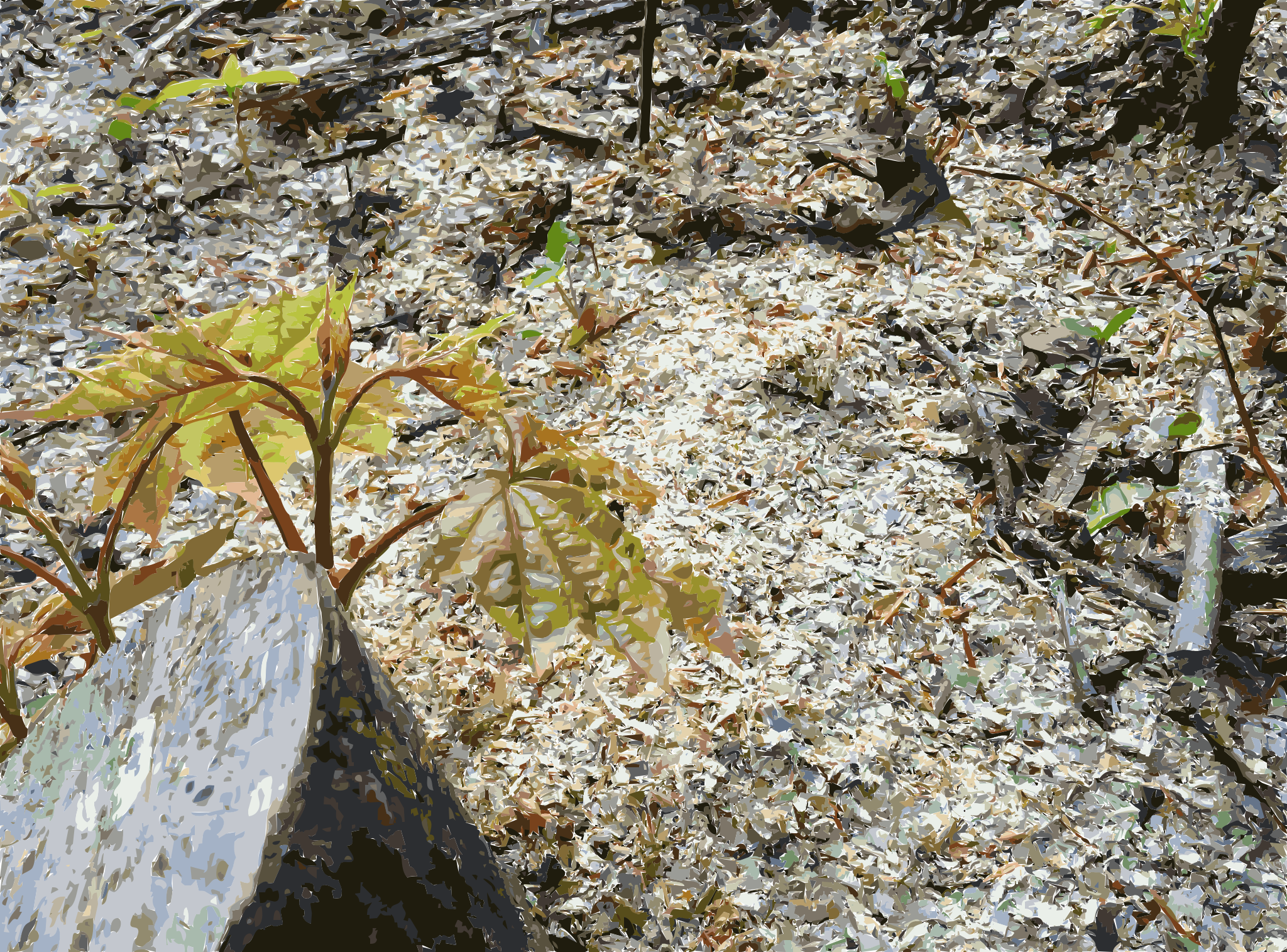 This features a small tree growing in the middle of a dirt field. The tree is surrounded by leaves, and it appears to be thriving despite its surroundings. In addition to the tree, there are several other plants scattered throughout the scene, adding to the natural atmosphere. A large rock can also be seen near the center of the image, providing an interesting contrast to the growing plant life. The overall setting gives off a sense of tranquility and harmony with nature.