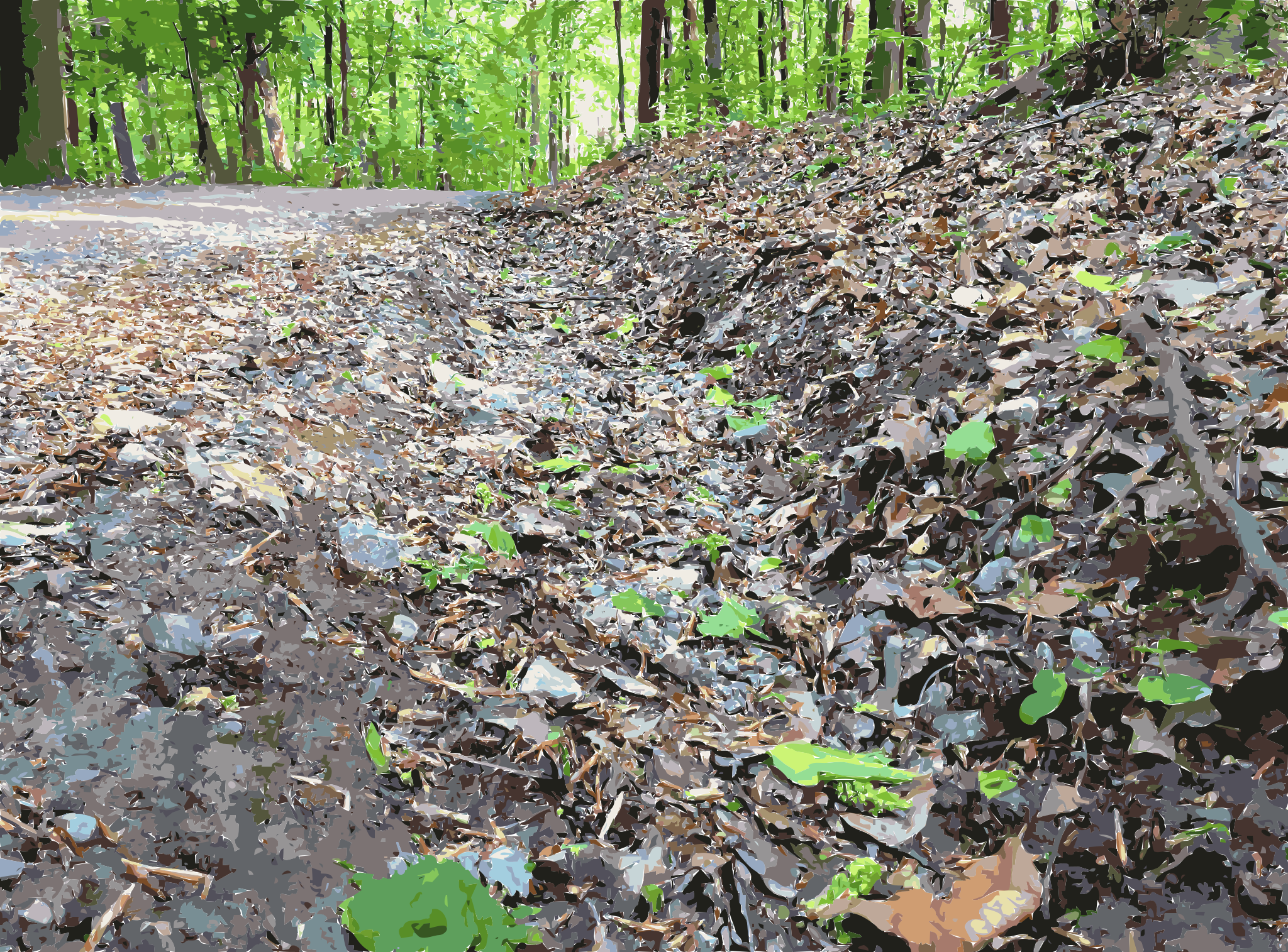 This features a dirt road surrounded by trees, creating a serene and natural atmosphere. Along the side of the road, there is a pile of leaves that have fallen from the trees, adding to the sense of tranquility in the scene. The leaves are scattered across the ground, with some closer to the foreground and others further away, giving the impression of a forest floor. This picturesque setting evokes feelings of peacefulness and relaxation, as one might imagine taking a leisurely walk down this path surrounded by nature.