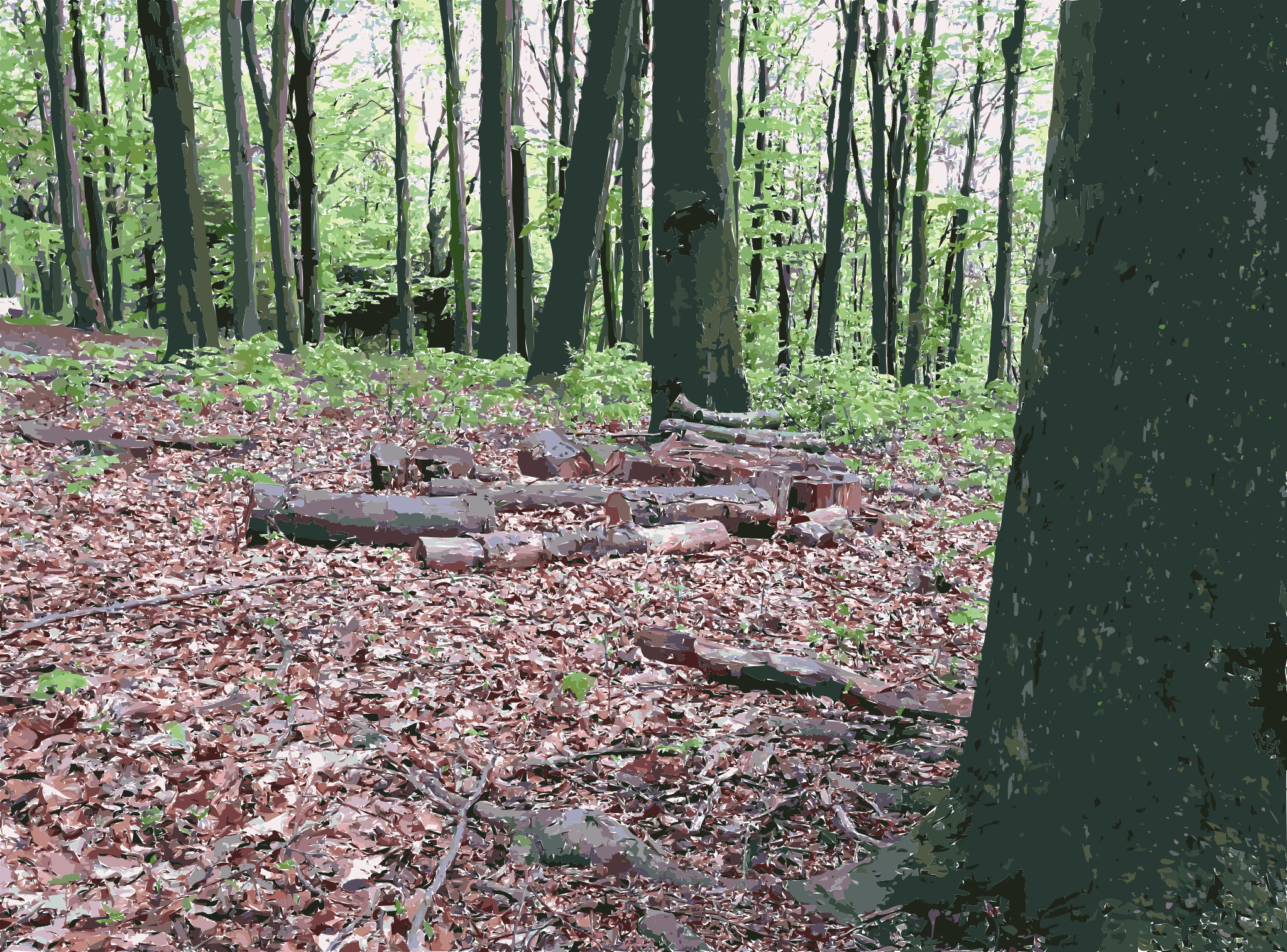 This depicts a forest with trees and leaves scattered throughout the scene. There are several logs on the ground, some of which appear to be cut up or broken. A large tree is visible in the middle of the forest, surrounded by other trees. The overall atmosphere suggests that this could be a park where people come to enjoy nature and take photographs.