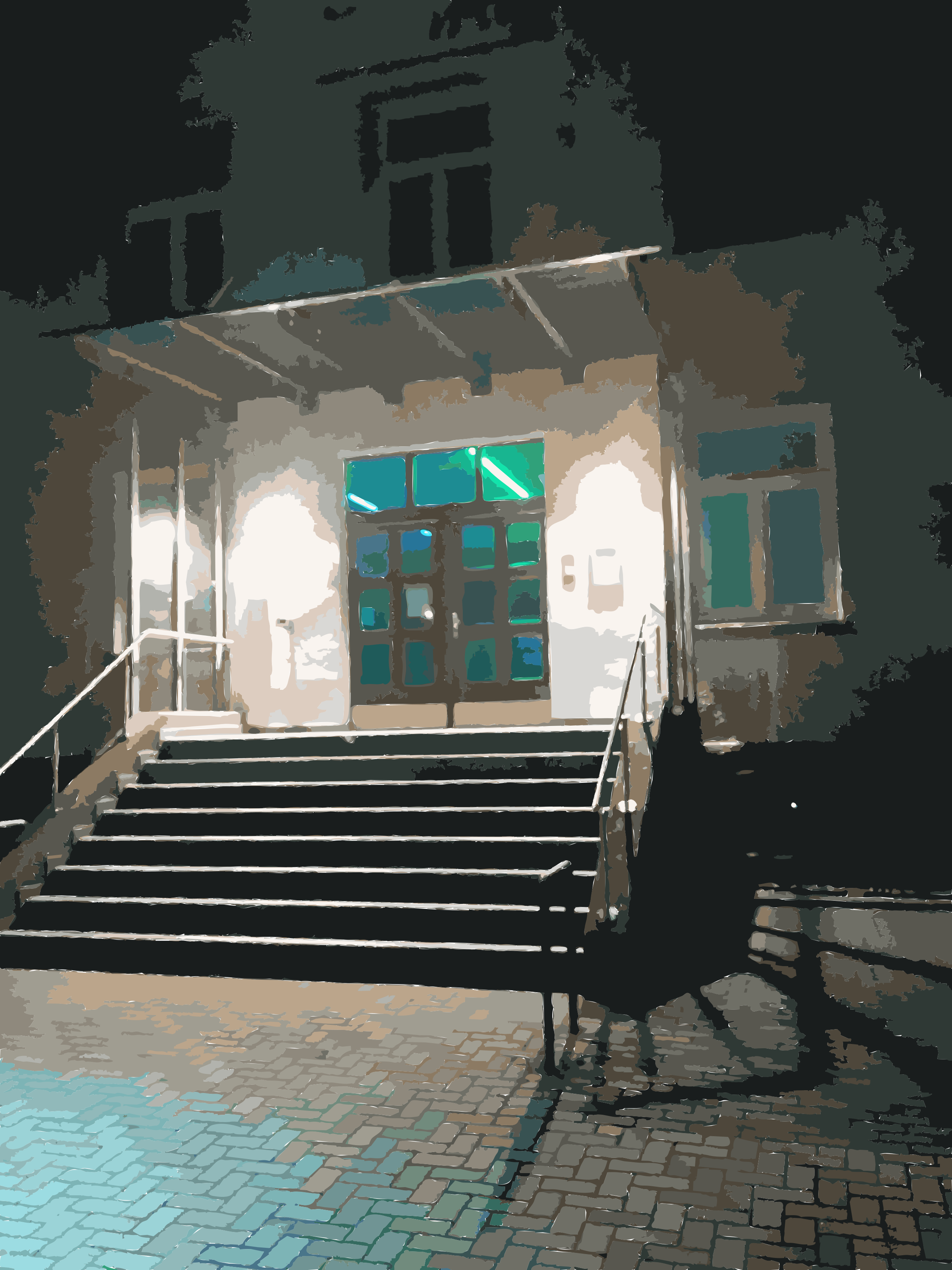 This features a large building with an entrance that has a set of stairs leading up to it. Above the doorway, there is a lighted sign that appears to be illuminated by neon lights. The building's facade is adorned with several windows, and the overall atmosphere suggests a sense of grandeur or importance. In front of the entrance, there are two benches placed for people to sit on while waiting or resting. Additionally, there is a chair located near one of the benches, providing extra seating options in the area.