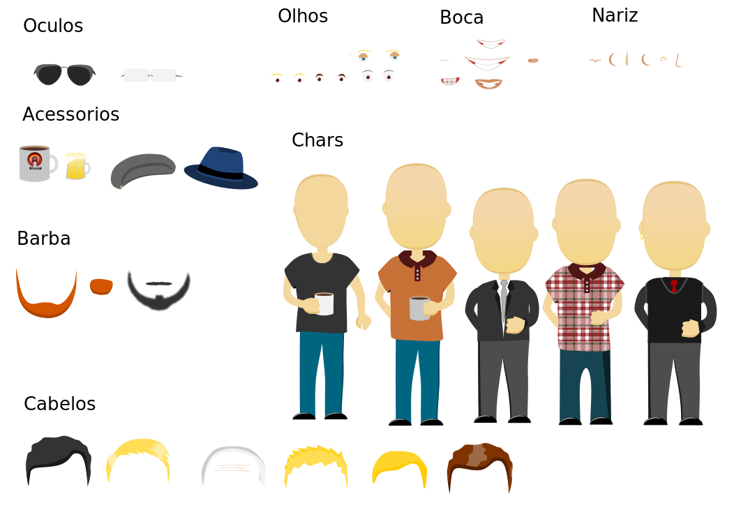 This is a colorful and detailed illustration of four men standing next to each other. Each man has a unique hairstyle, with one man having a beard, another wearing glasses, the third man with short hair, and the fourth man with long hair. They are all dressed in different outfits, showcasing various styles and colors. The illustration is accompanied by a list of items that include clothing, accessories, and facial features. There are several ties, hats, shirts, and other clothing items displayed throughout the image. Additionally, there are multiple pairs of glasses, some with different styles and colors. The facial features section includes beards, mustaches, and various hairstyles for each man in the illustration. Overall, this image is a creative representation of diverse individuals and their unique appearances.