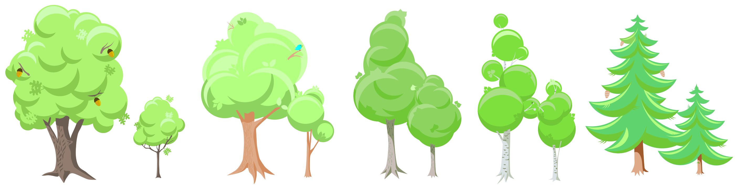 This features a row of five different trees, each varying in size and shape. They are arranged side by side, creating an organized and visually appealing scene. The trees are lined up along the top edge of the image, with their trunks extending from left to right. Each tree has its unique characteristics, making it interesting for viewers to observe and appreciate the diversity in nature.
