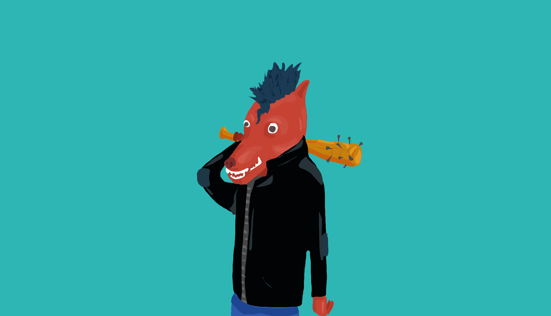 This features a cartoon-like drawing of a man with a horse's head, wearing a black jacket. He is holding the horse's head in his hands and appears to be petting it. The horse has a guitar on its back, adding an interesting element to the scene. The overall composition creates a unique and whimsical visual experience.