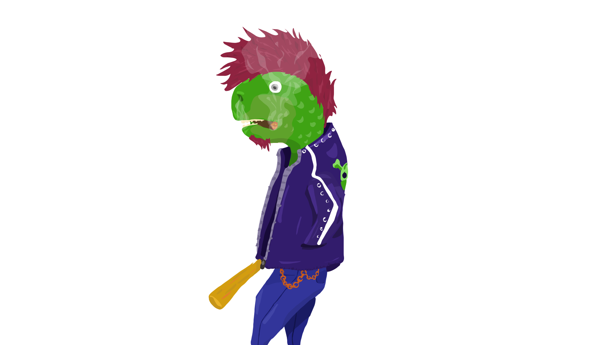 This features a cartoon character, possibly a lizard or a frog, wearing a jacket and holding a baseball bat. The character appears to be standing in the foreground of the scene, with its arms outstretched. In addition to the main character, there are two other people visible in the background, one on the left side and another further back on the right side. A sports ball can also be seen near the center of the image, adding to the playful atmosphere.