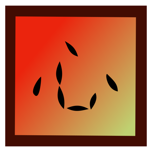 This features a square with an orange background and a black outline. Inside the square, there are four small circles that resemble leaves or flowers. These circles are positioned at various angles within the square, creating a visually appealing pattern. The overall design of the image gives it a vibrant and artistic appearance.