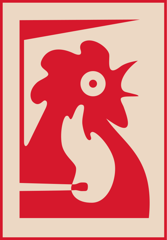 This features a red rooster with an open beak, giving the impression of yelling. It is depicted in a red and white color scheme, which adds to its bold appearance. The rooster's head occupies most of the frame, making it the focal point of the image. This artistic representation of a rooster may have cultural or symbolic significance, as it could be an example of Russian folklore where the rooster is personified as a character with human-like qualities. The rooster's open beak and its prominent position in the frame create a striking visual impact that captures the viewer's attention.