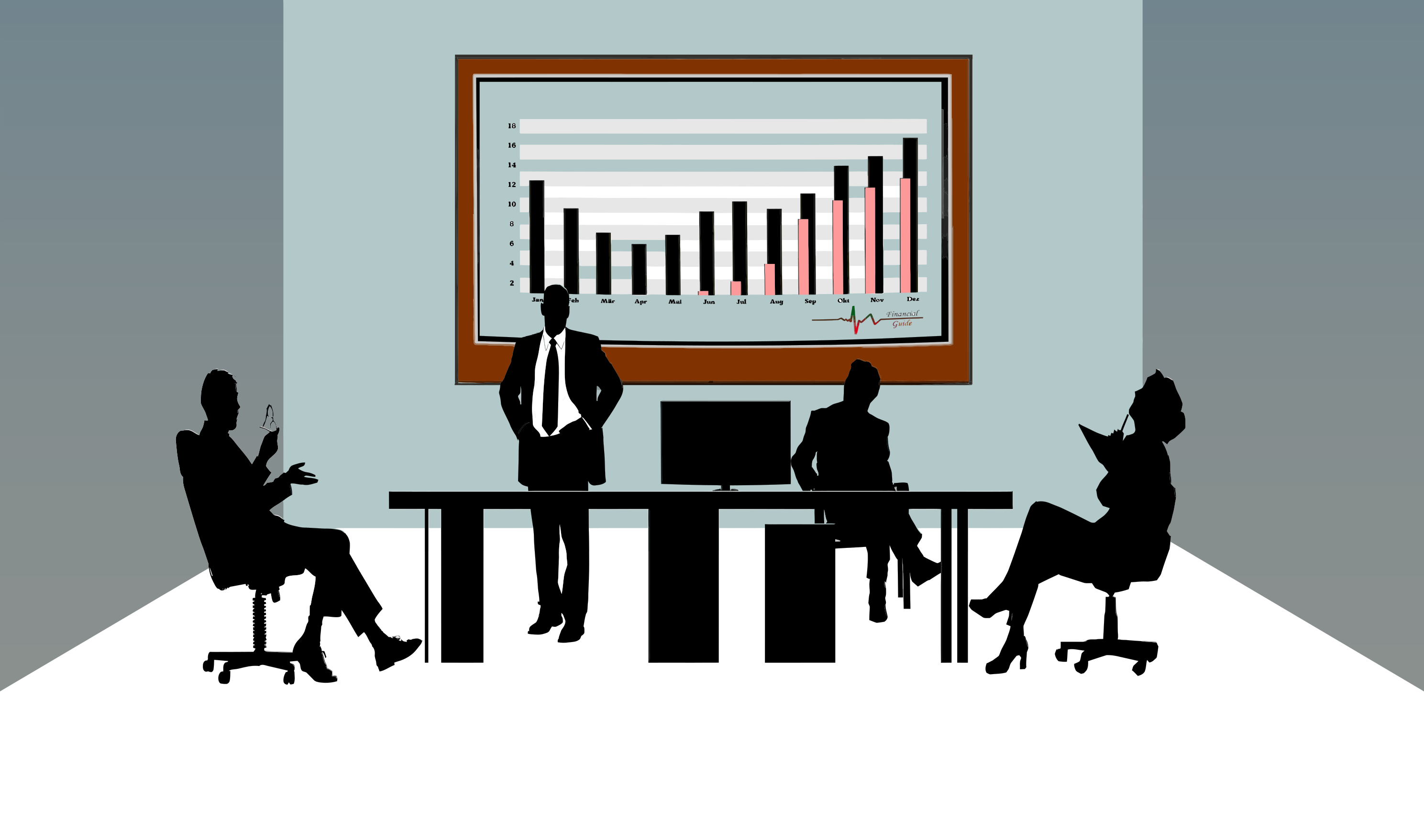 This depicts a group of four people in a conference room, engaged in a business meeting. They are seated around a large table with a laptop and a TV screen on it. A board is also present in the scene, which likely contains important information for their discussion. Each person appears to be dressed professionally, wearing ties as part of their attire. The room has multiple chairs placed around the table, suggesting that more people could join the meeting if needed. Overall, it's a typical business setting where decisions and strategies are being discussed by the team members.