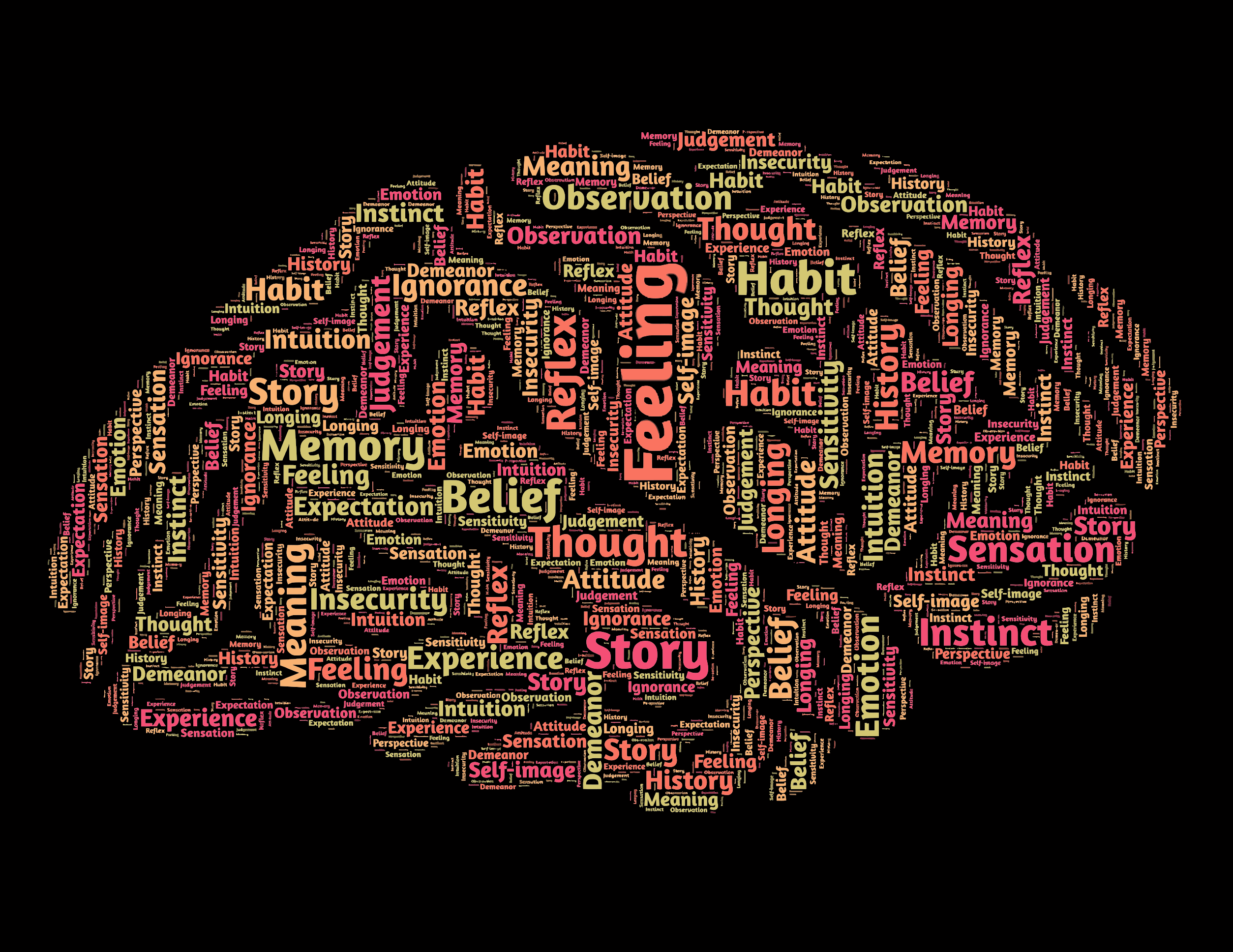 This features a close-up of a brain with various words and phrases written in red. These words are arranged to form the shape of a brain, creating an interesting visual effect. The text is scattered all over the brain, covering different areas and angles. Some of the words include "belief," "feeling," "thought," "story," "instinct," "habit," "memory," "sense," "tale," "insight," and "perspective." The combination of these words and phrases creates a unique and engaging representation of the brain.