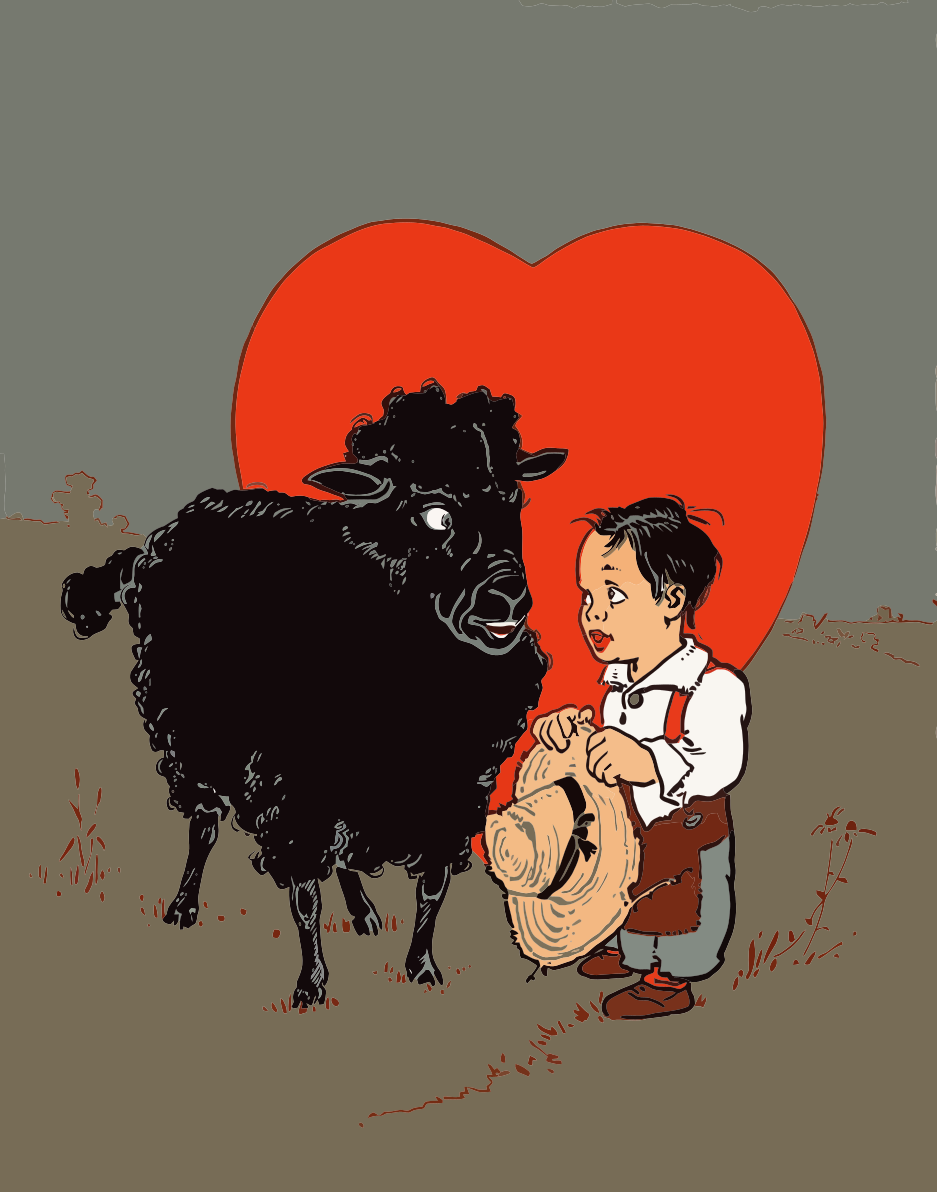 Tags: animal, black, boy, cartoon, character, child, heart, literature, male, semi-realistic people, sheep, story