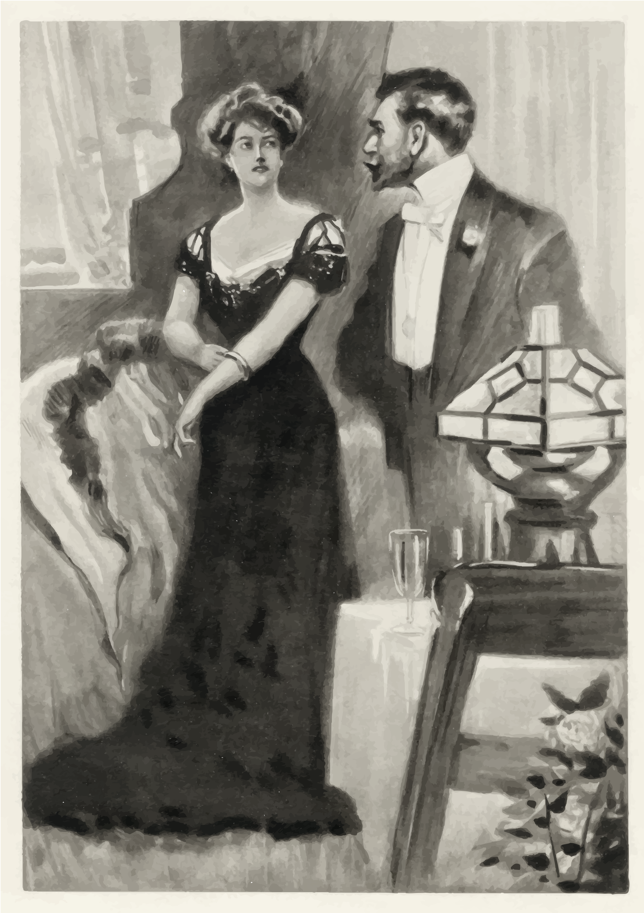 This is a black and white drawing of two people, a man and a woman, standing next to each other. They appear to be engaged in conversation or possibly discussing something related to the man's attire. The man is wearing a tie, which suggests that they might be at an event or gathering where formal attire is required. The woman appears to be dressed elegantly as well, further emphasizing the formality of their setting. The drawing captures the essence of the scene and evokes a sense of sophistication and refinement.